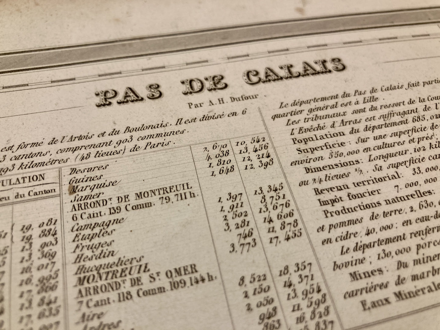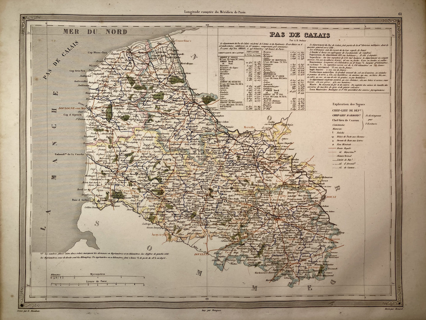 This old map of Pas-de-Calais accompanied by some statistics come from the Atlas of the 86 departments and the French Colonies. It was produced by the Geographer Auguste-Henri Dufour and printed during the 19th century. Its size is 41x32cm.