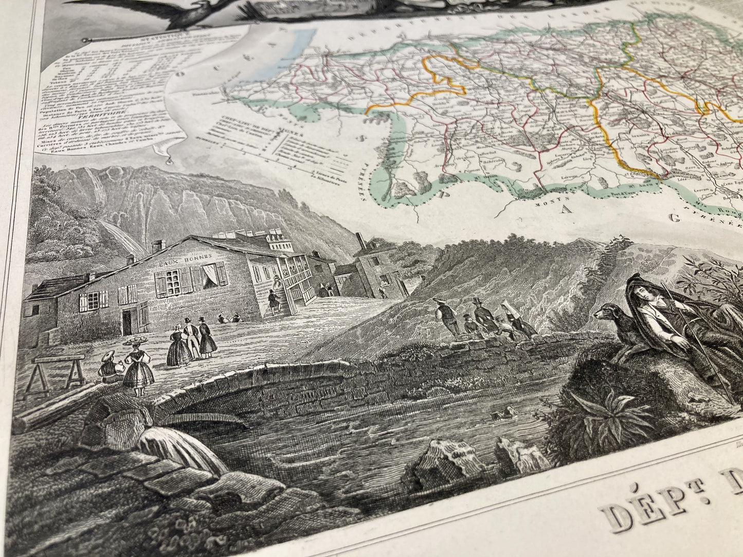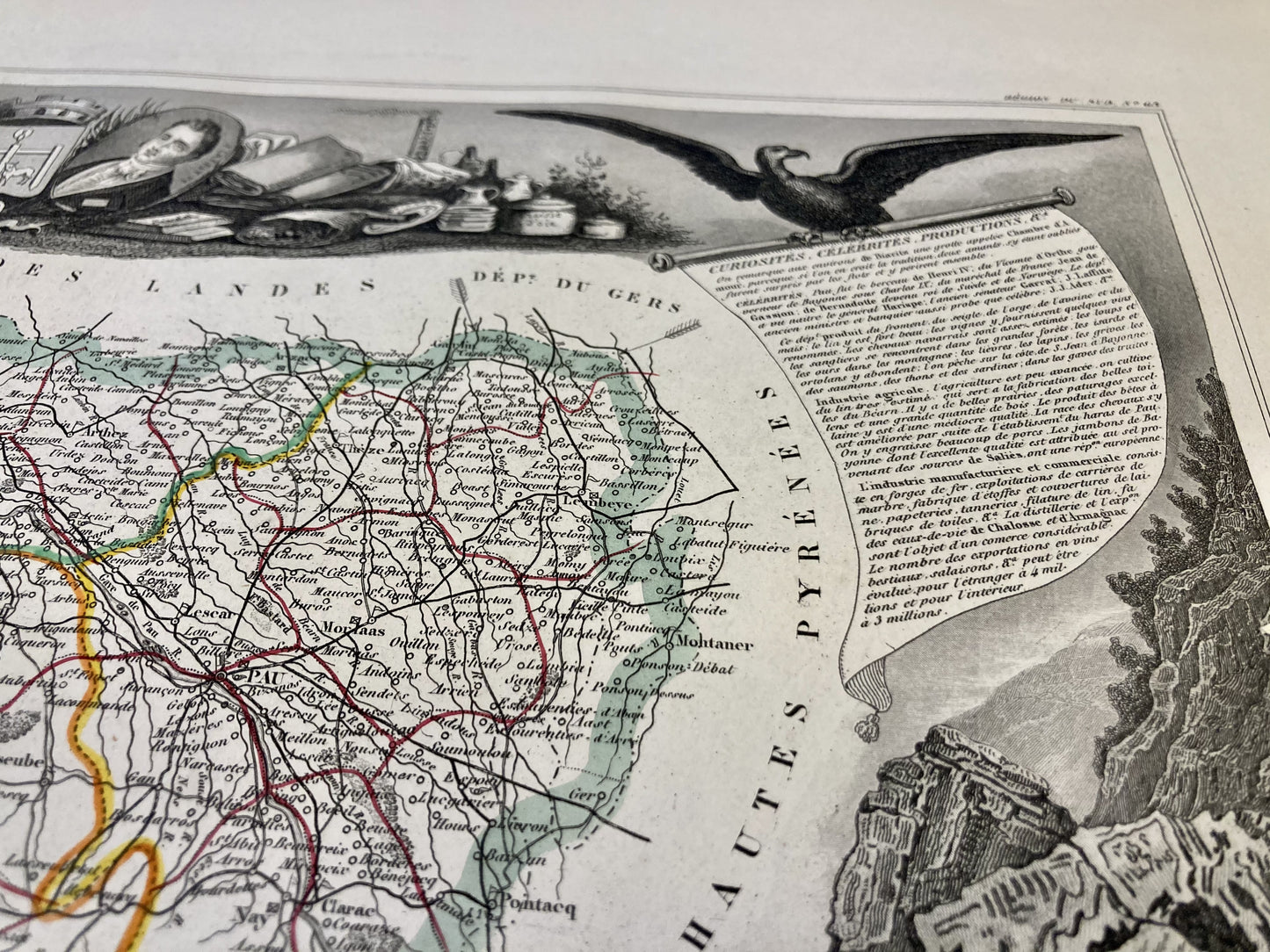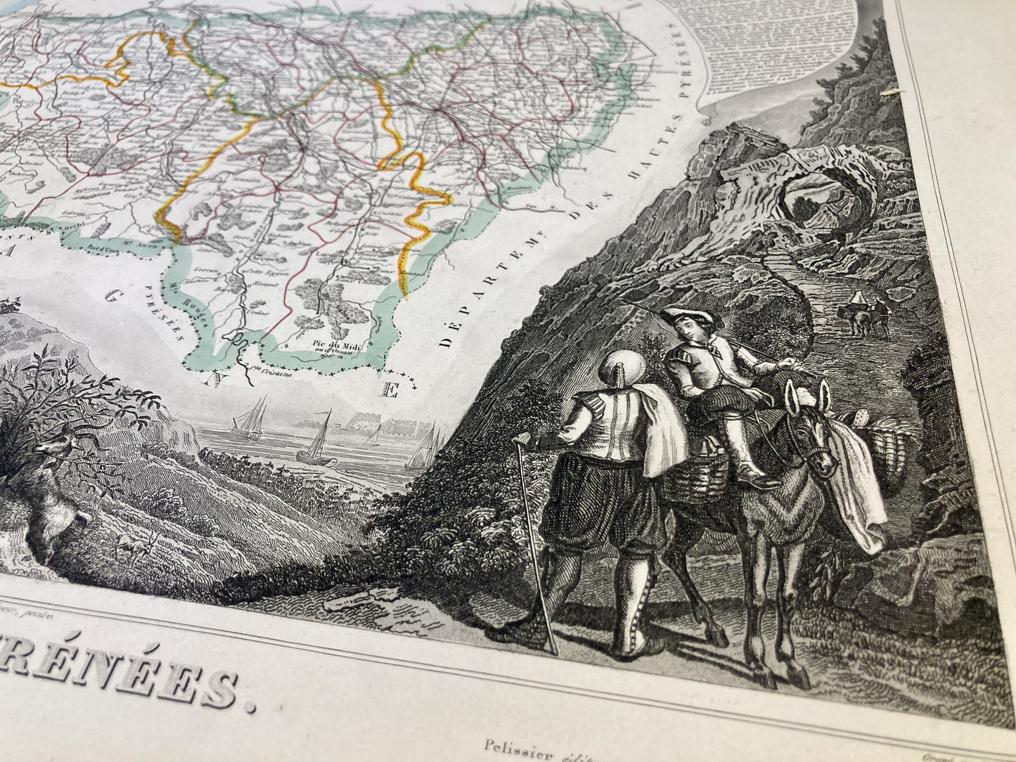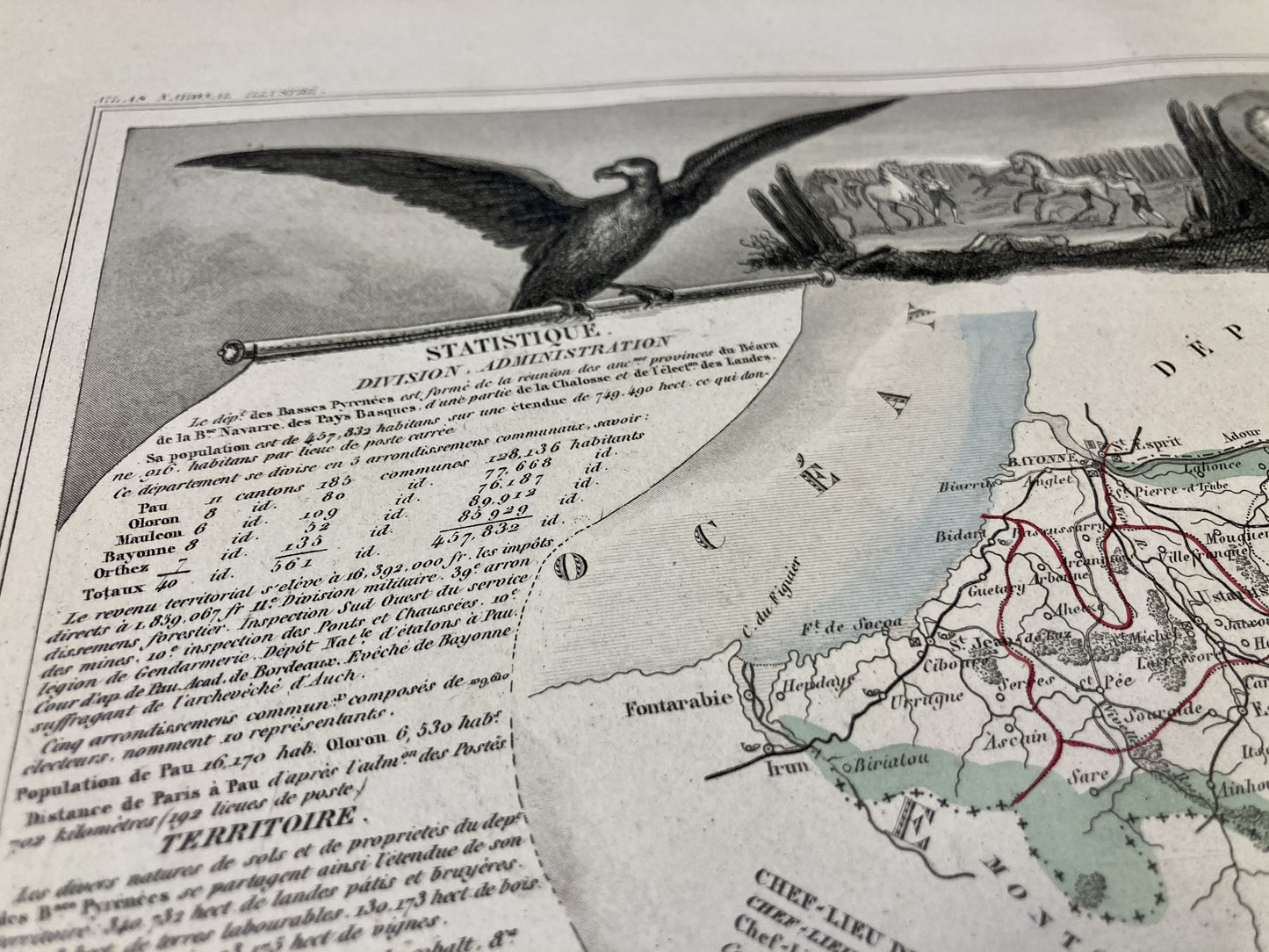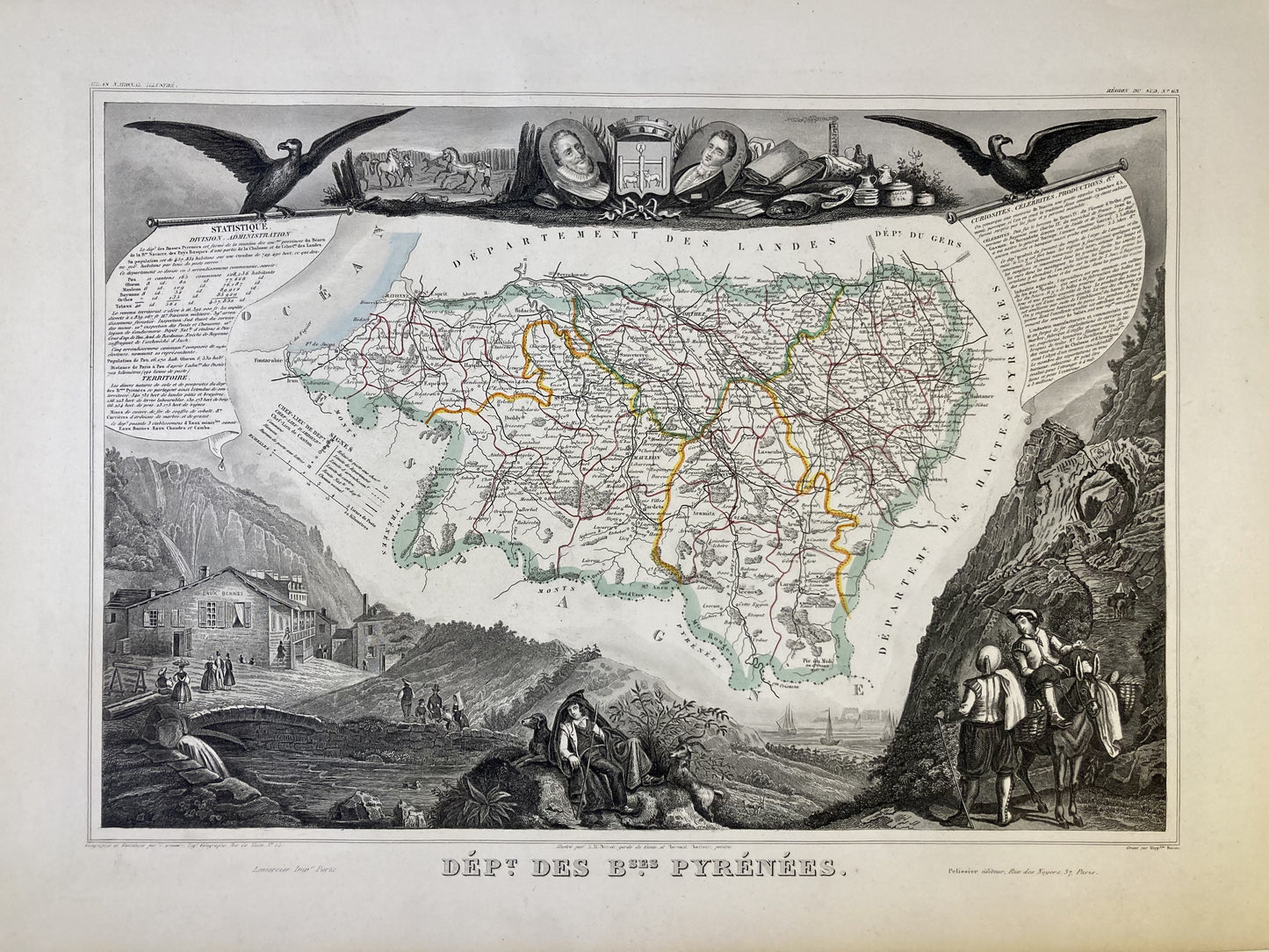 This antique map of the Pyrénées-Atlantiques is decorated with illustrations representing its specialties and some statistical, historical and economic information. It comes from the Illustrated National Atlas and was produced by the Geographer Victor Levasseur between 1842 and 1872. Its size is 53x36cm (to the nearest 2cm). We find on this map the towns and villages of the Pyrénées-Atlantiques of the time.