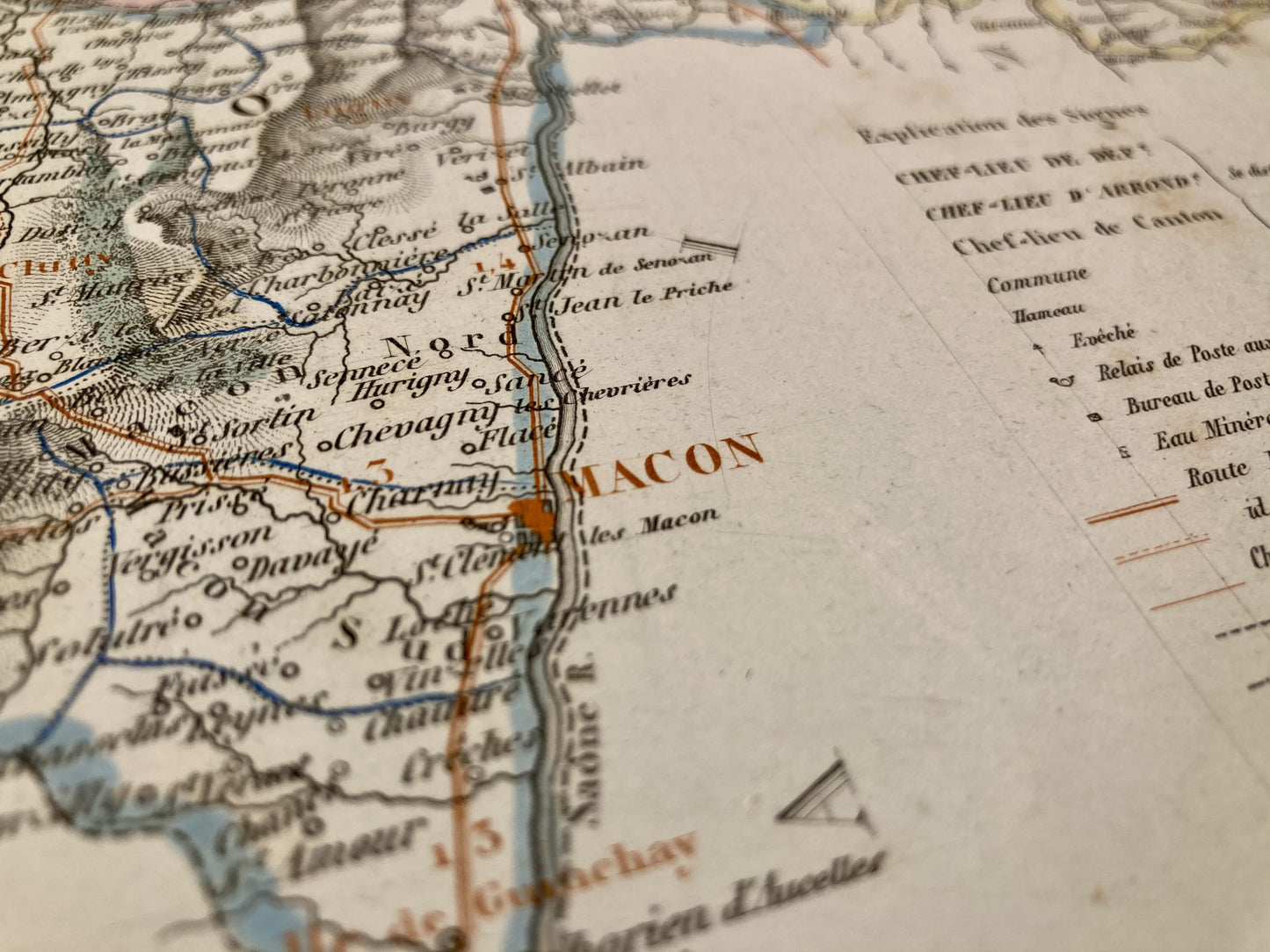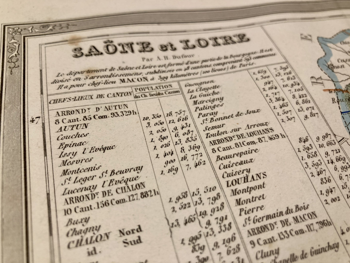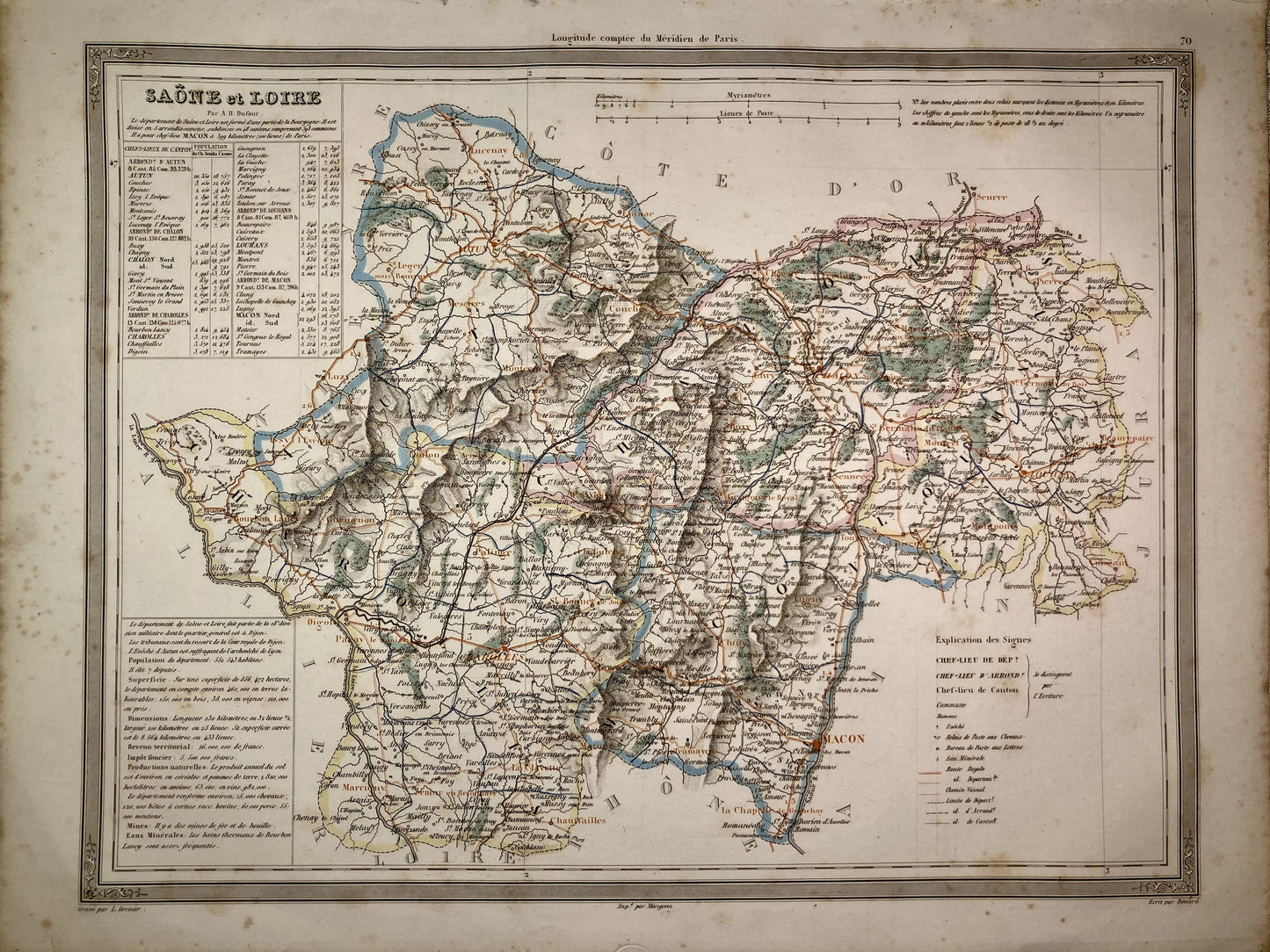 This old map of Saône-et-Loire accompanied by some statistics come from the Atlas of the 86 departments and the French Colonies. It was produced by the Geographer Auguste-Henri Dufour and printed during the 19th century. Its size is 41x32cm.