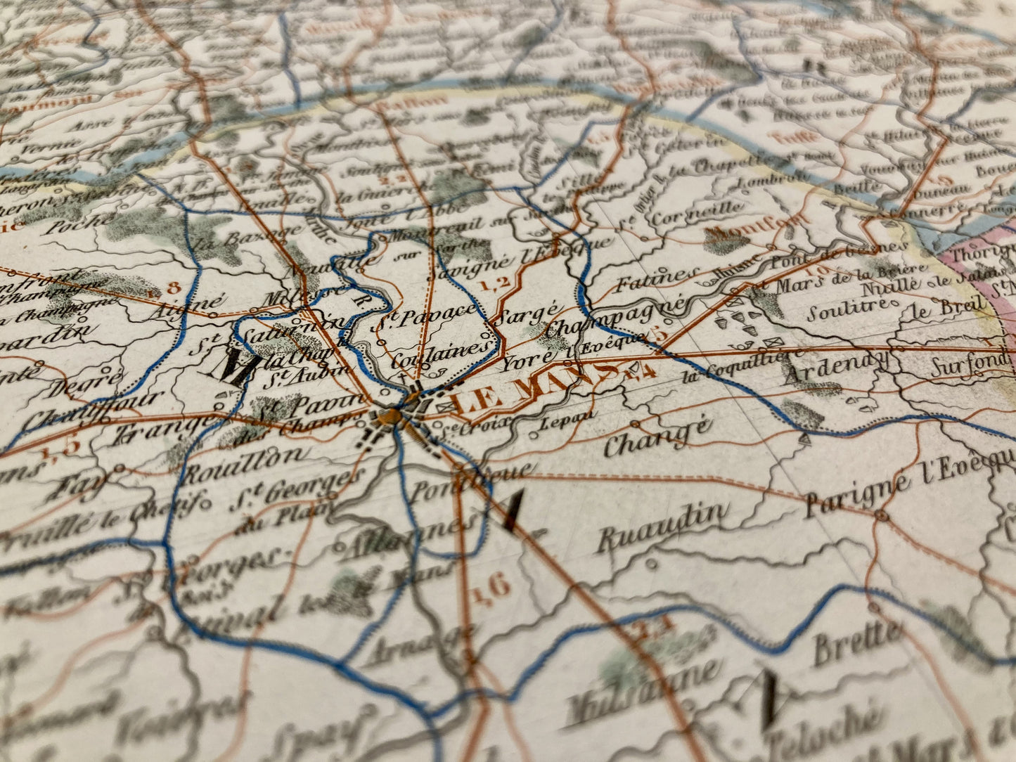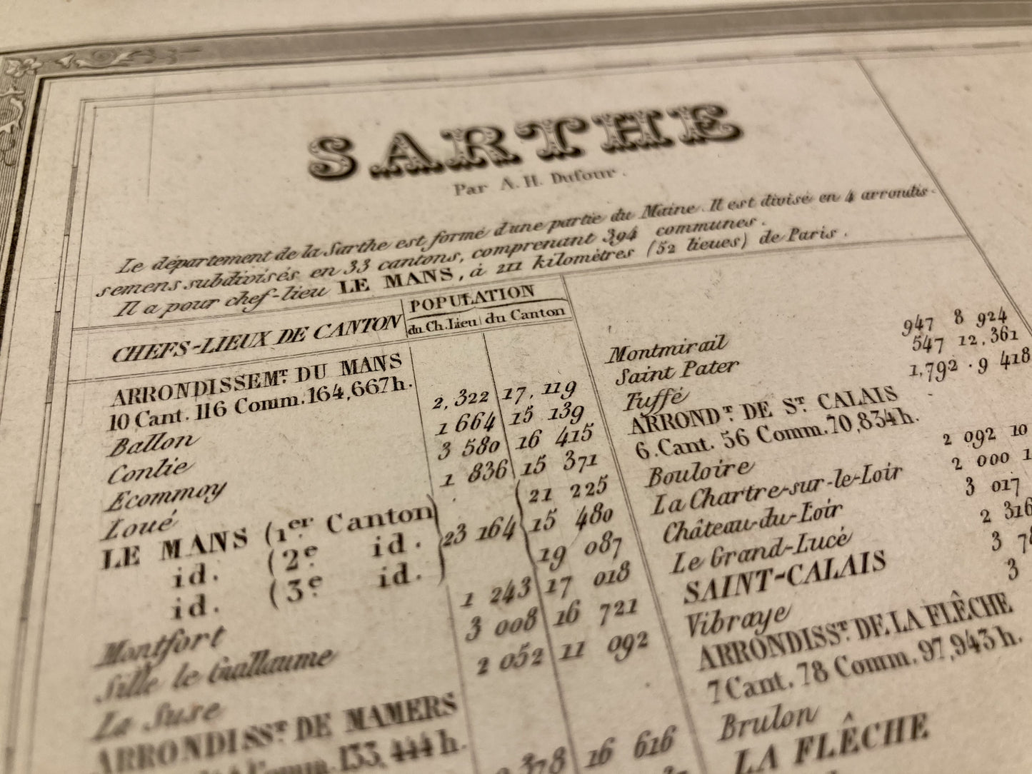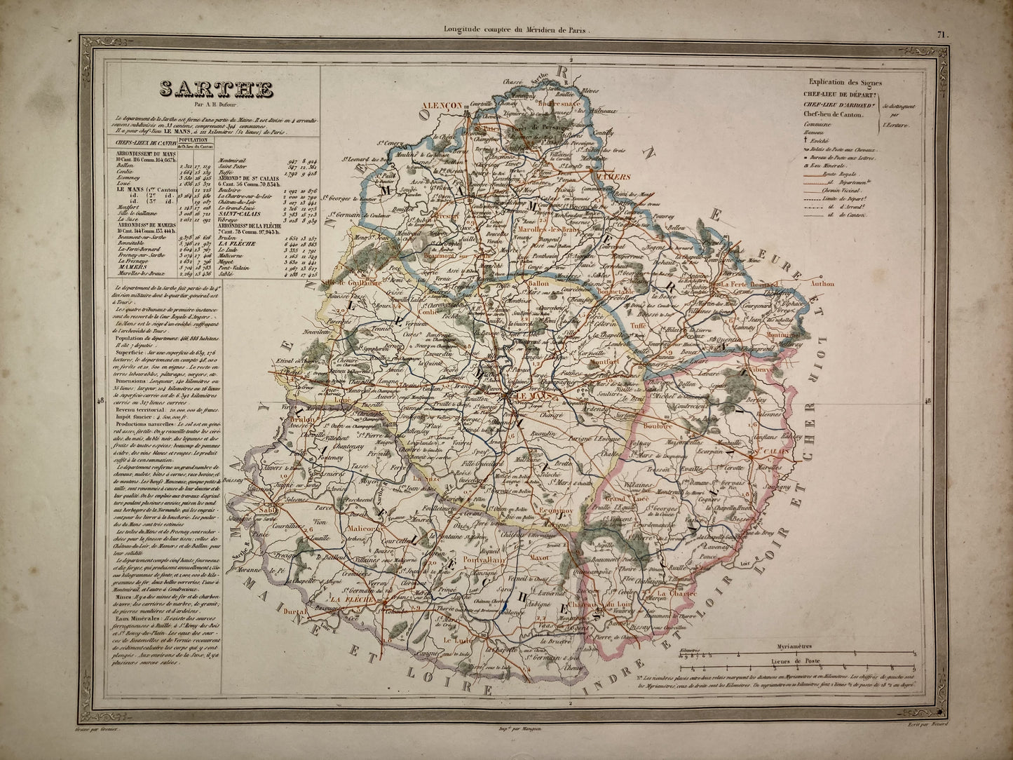 This old map of Sarthe accompanied by some statistics comes from the Atlas of the 86 departments and the French Colonies. It was produced by the Geographer Auguste-Henri Dufour and printed during the 19th century. Its size is 41x32cm.