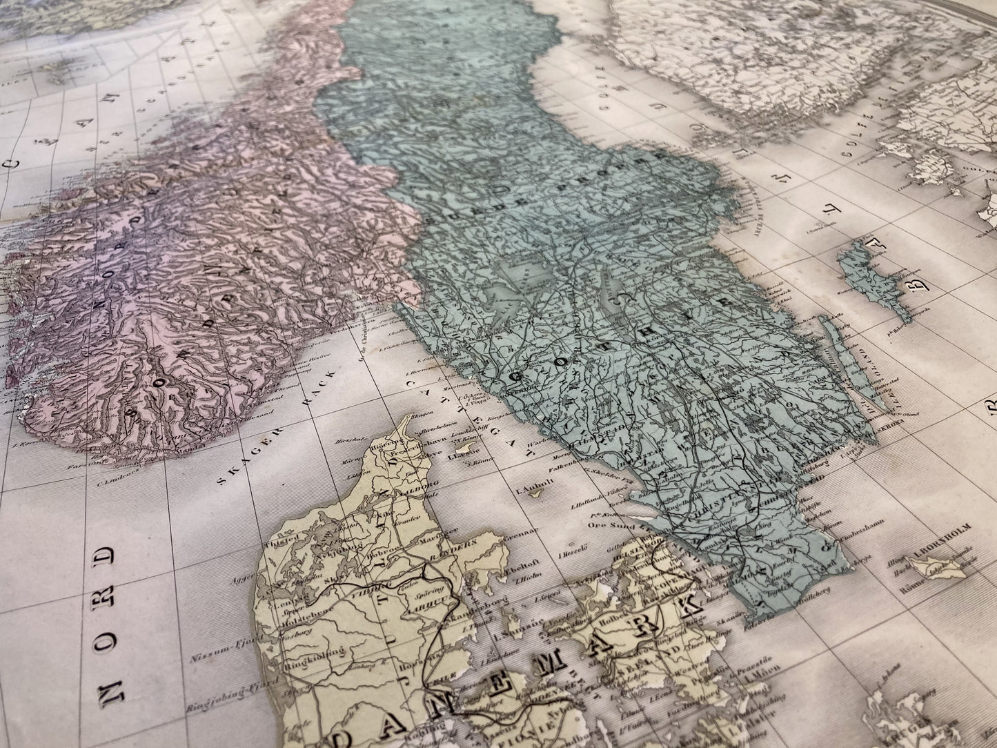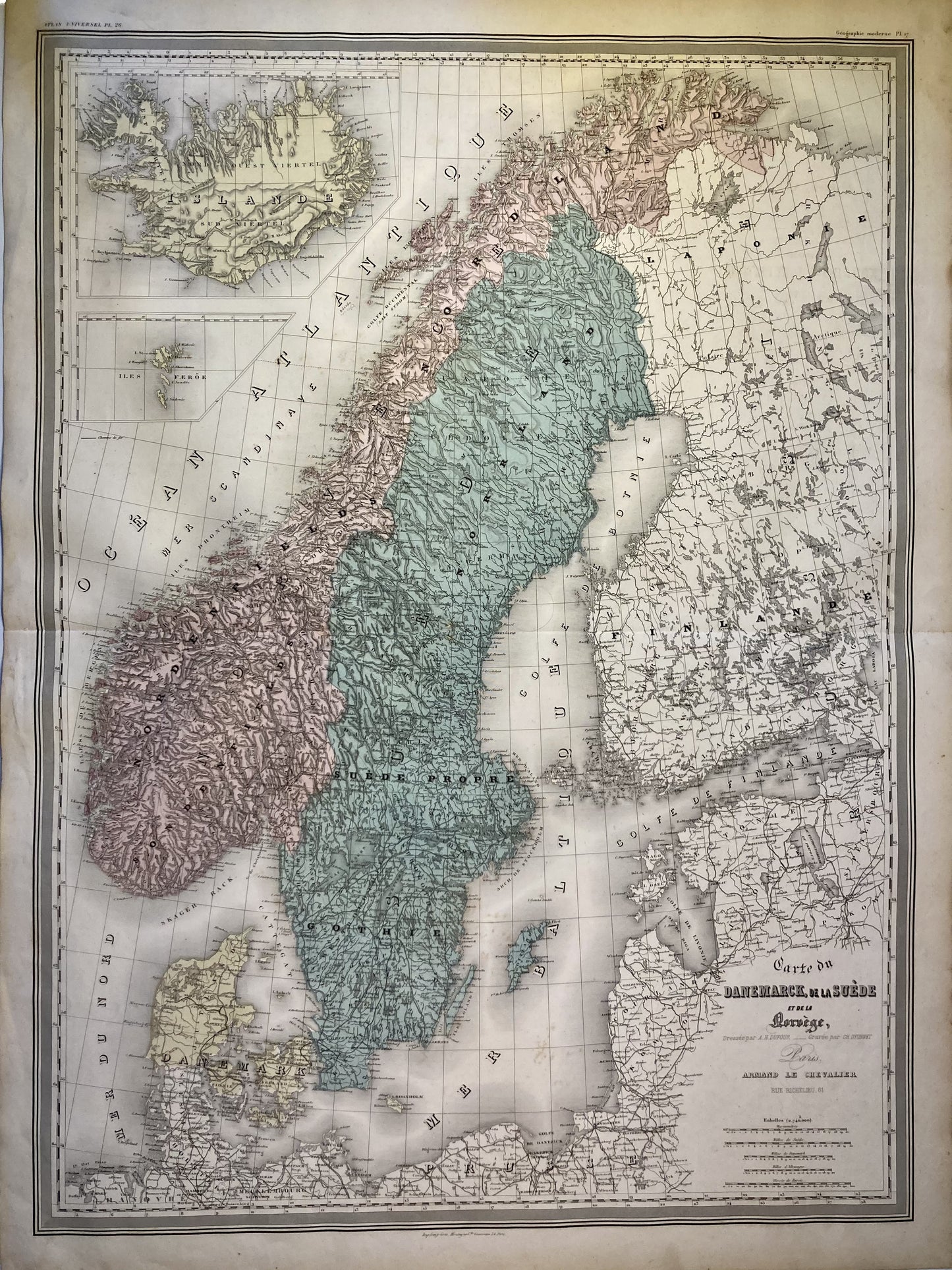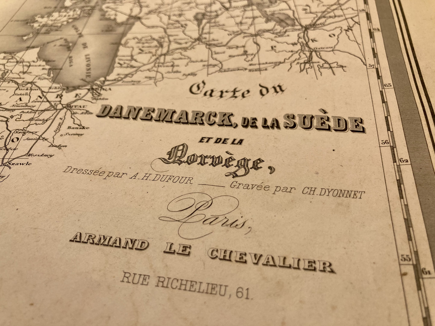 This antique map of Scandinavia was produced by the geographer AH Dufour. It dates from the middle of the 19th century and its size is 81x60cm.