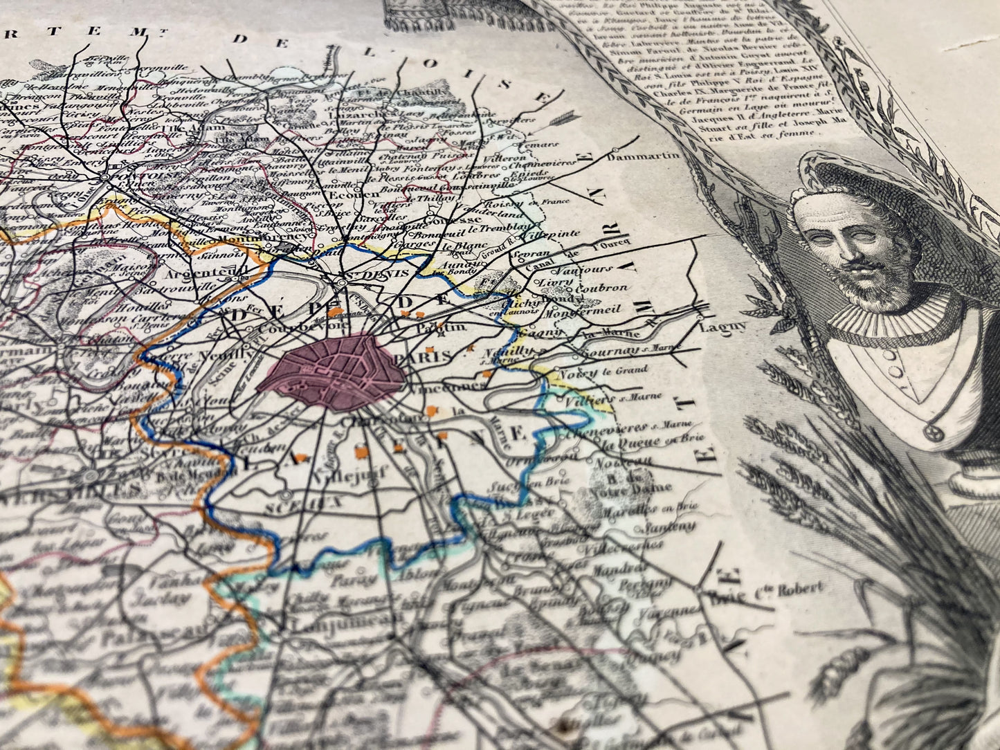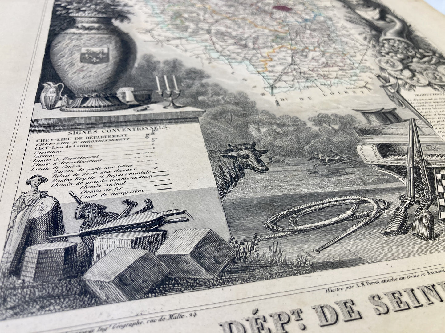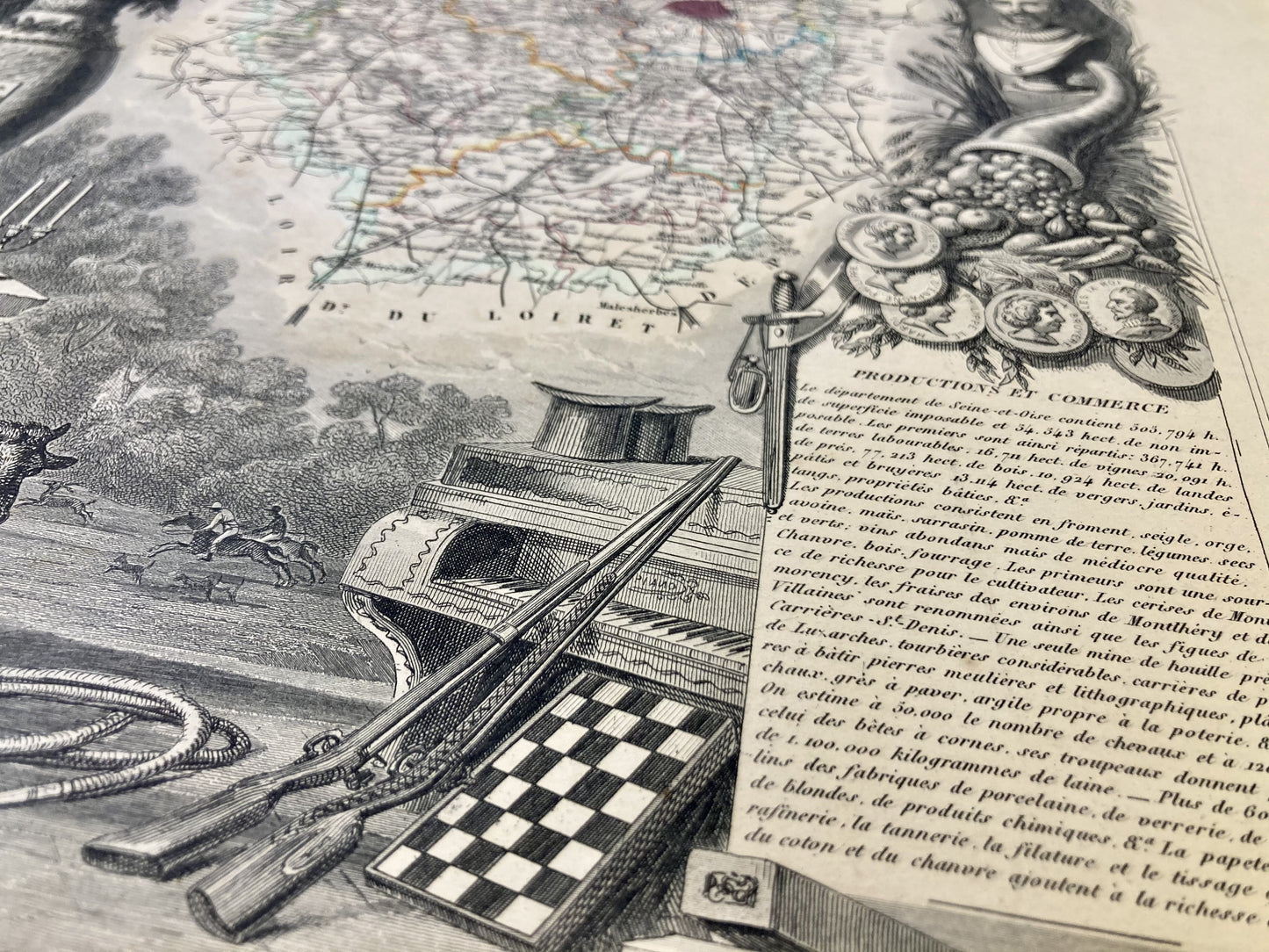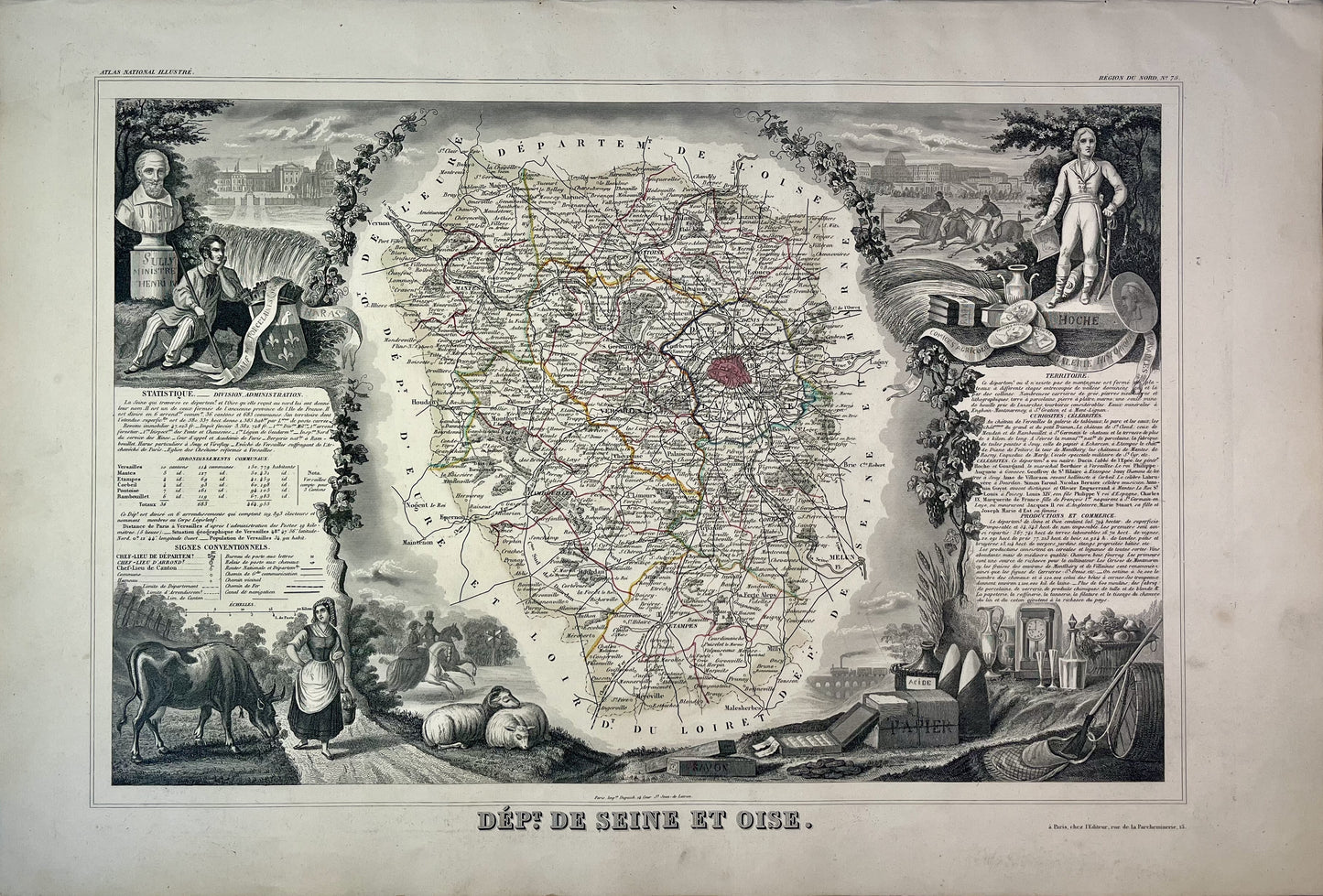 This antique map representing the department of Seine-et-Oise (in 1968, six departments replaced it: Yvelines, Essonne, Hauts-de-Seine, Seine-Saint-Denis, Val-de-Marne and Val-d'Oise), its specialties and some statistical, historical and economic information comes from the Illustrated National Atlas. It was produced by the Geographer Victor Levasseur and printed between 1842 and 1872. Its size is 53x36cm (to the nearest 2cm). We find on this map the towns and villages of Seine-et-Oise of the time.