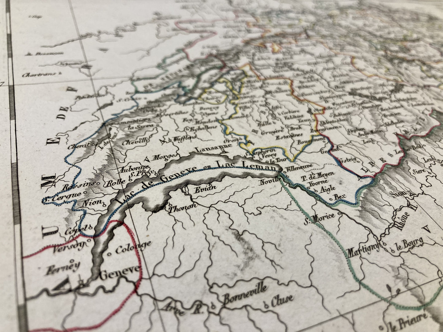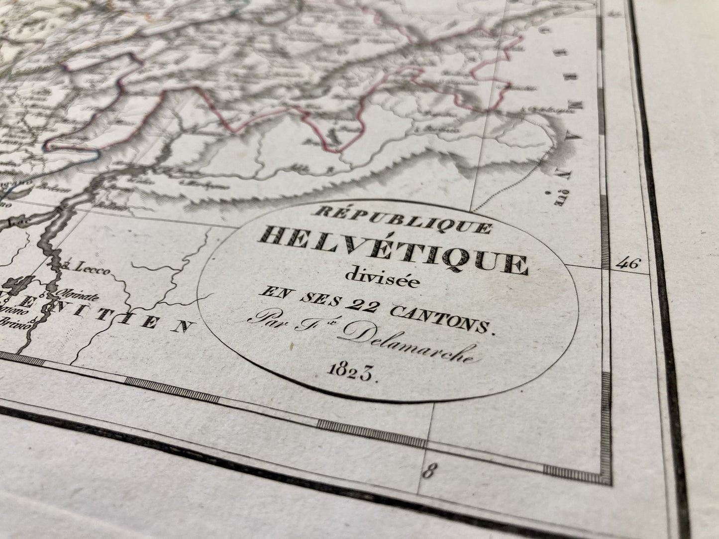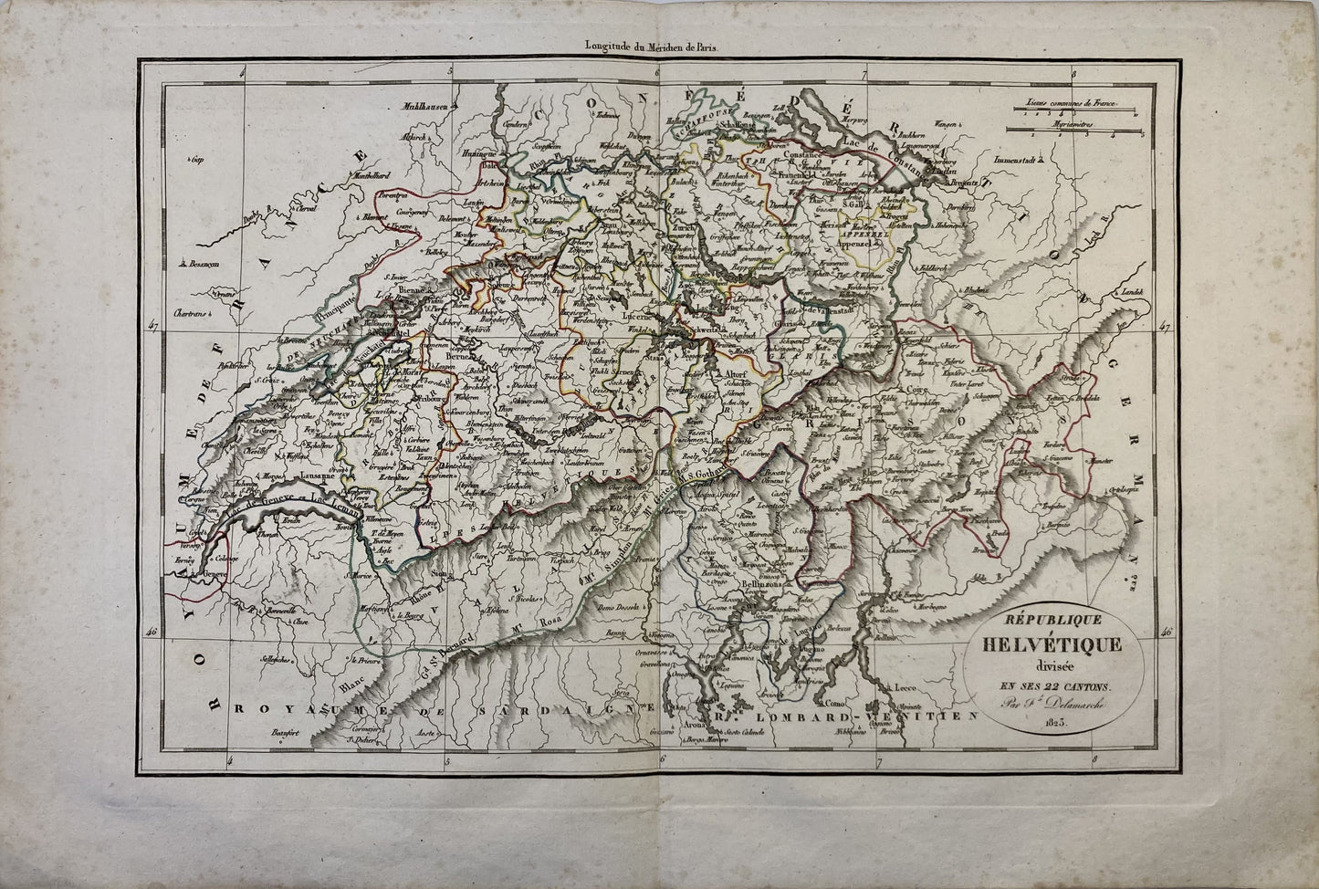 This antique map of Switzerland divided into its 22 cantons was produced by Félix Delamarche, successor to Robert de Vaugondy, Geographer of the King. It is dated 1823 and its size is 48x32cm.