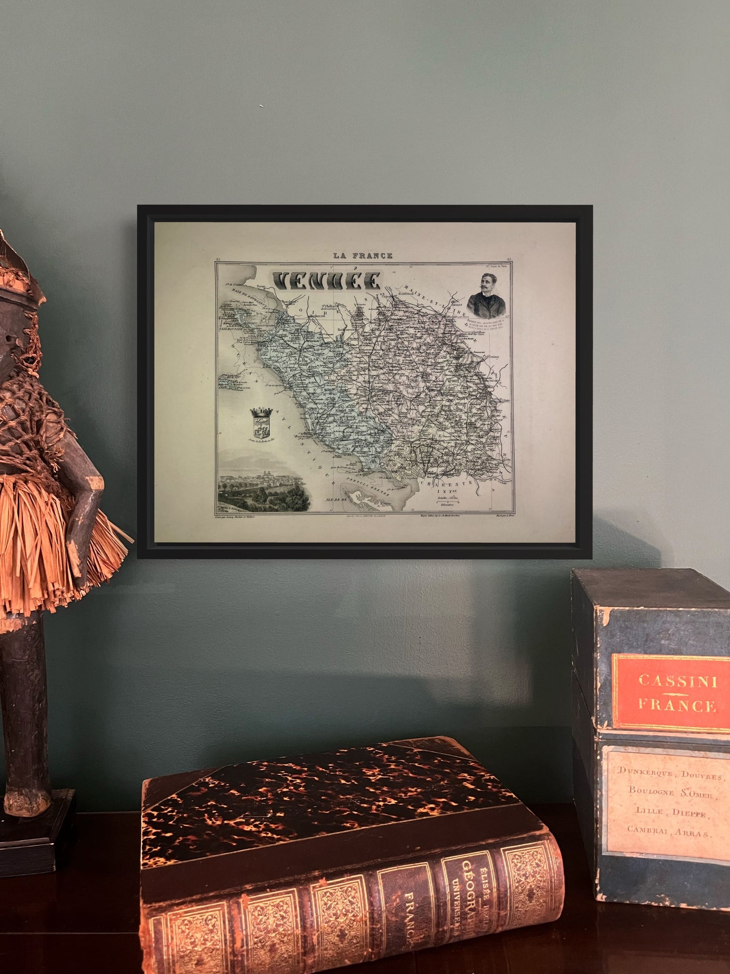 This old map of Vendée is colored and decorated with illustrations representing famous people from the department as well as a view of the town of La Roche-sur-Yon. It comes from the Nouvel Atlas National Illustré, a work published during the end of the 19th century and the beginning of the 20th, and was produced by the geographers A. Vuillemin, L. Thuillier, Ch. Lacoste and G. Lorsignol. Its size is 39x29cm. We find on this map the towns and villages of Vendée at the time.