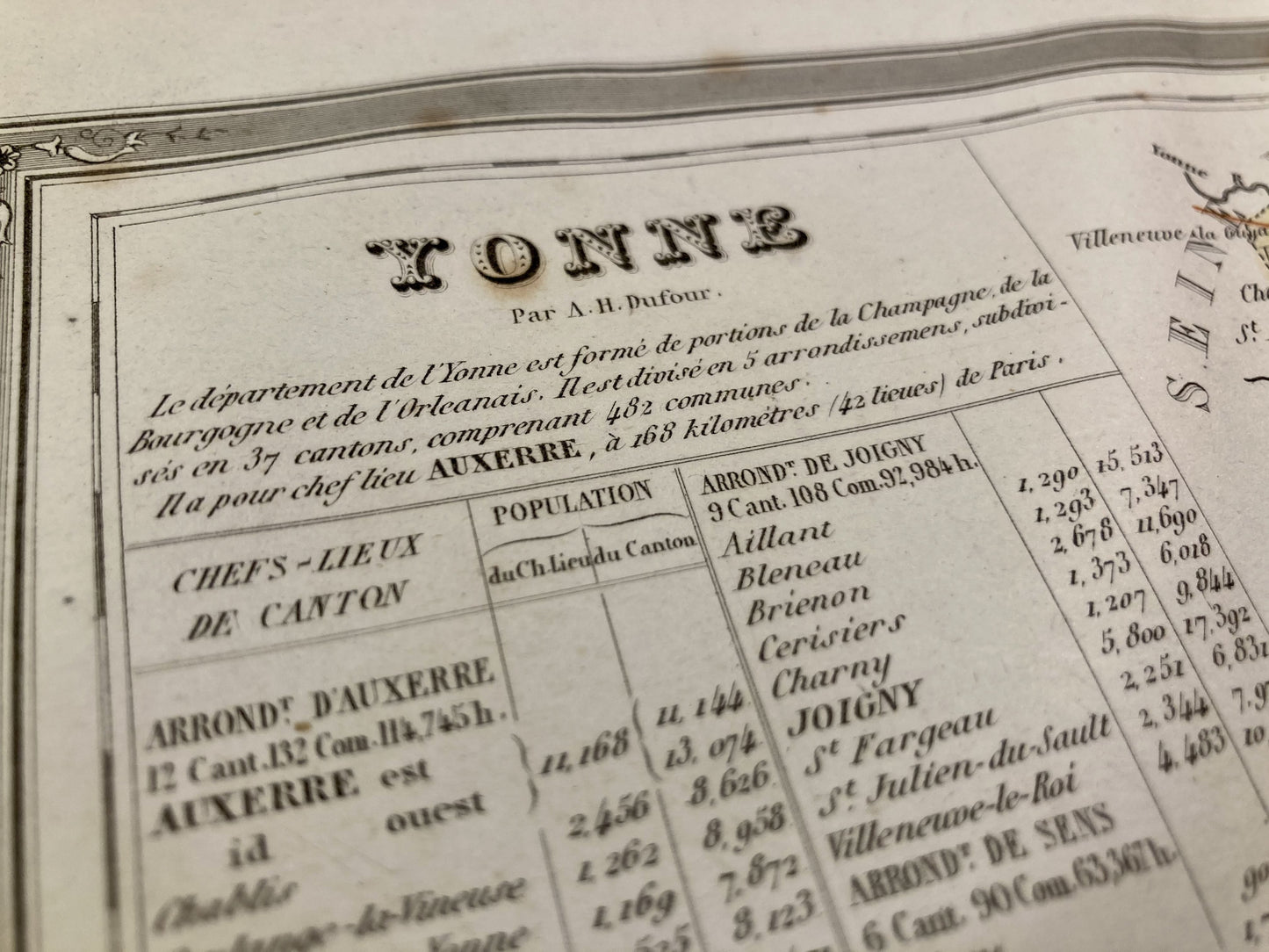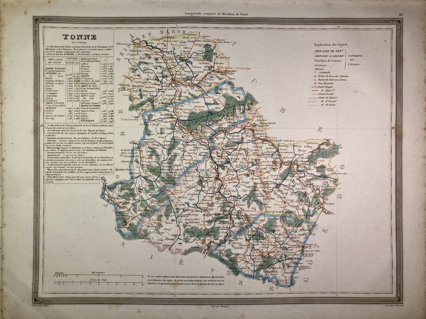 This old map of Yonne accompanied by some statistics comes from the Atlas of the 86 departments and the French Colonies. It was produced by the Geographer Auguste-Henri Dufour and printed during the 19th century. Its size is 41x32cm.