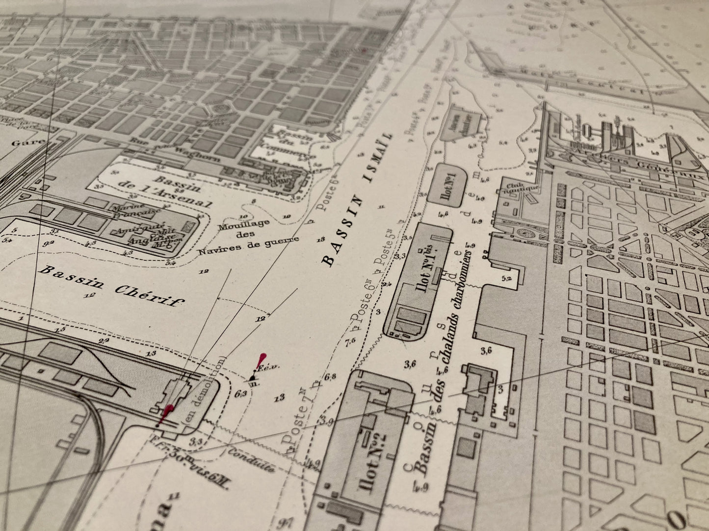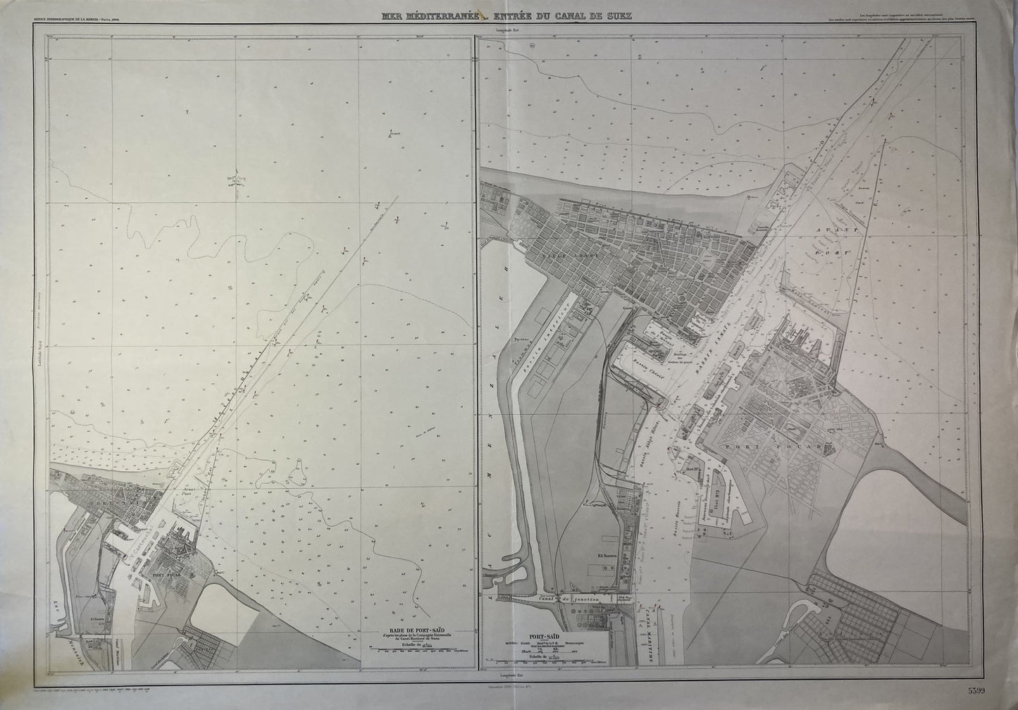 This old nautical chart representing the entrance to the Suez Canal, Port Said, was produced by the Service Hydrographique de la Marine, ancestor of the SHOM. Its dimension is 105.5x74.5cm.