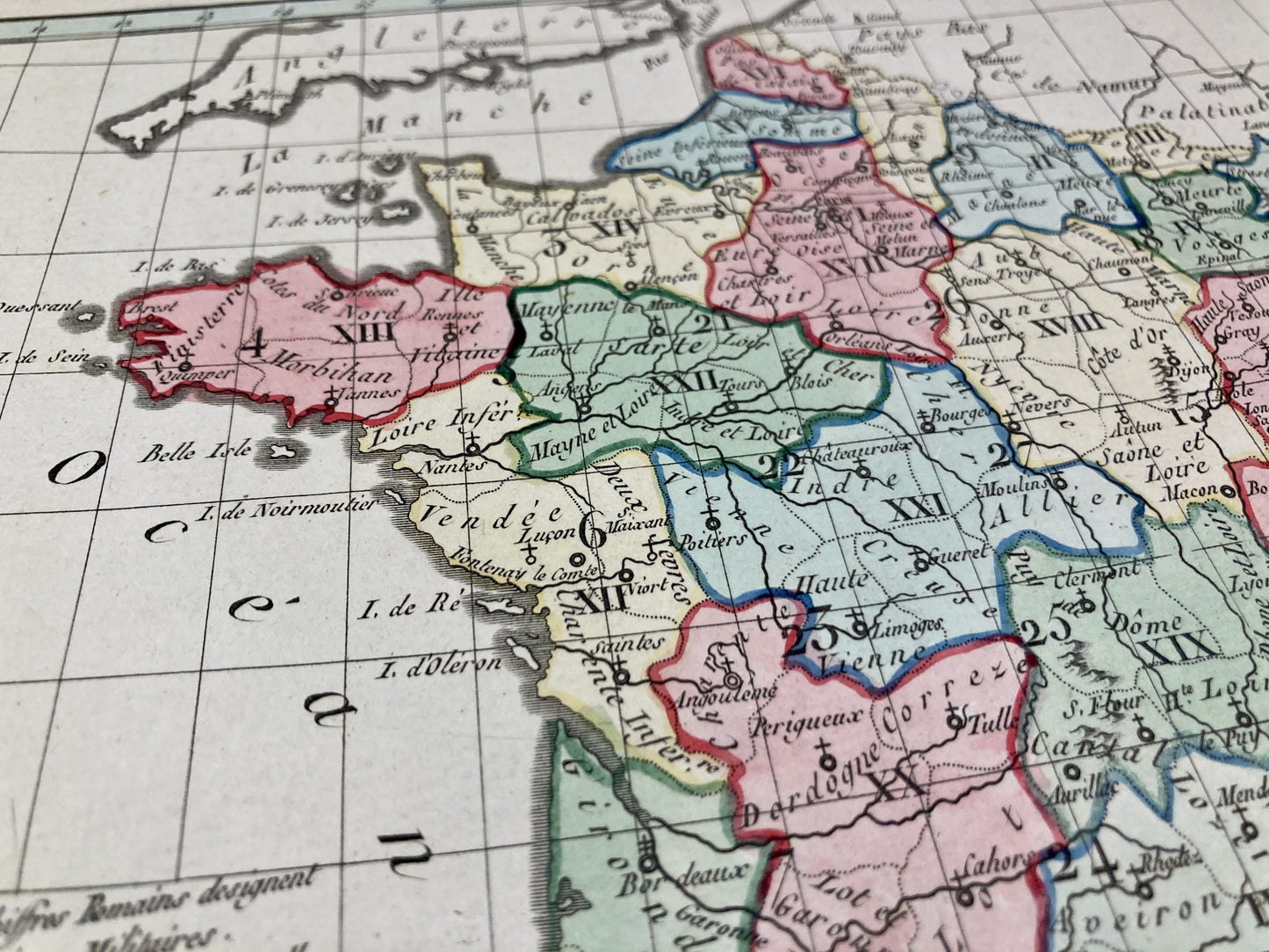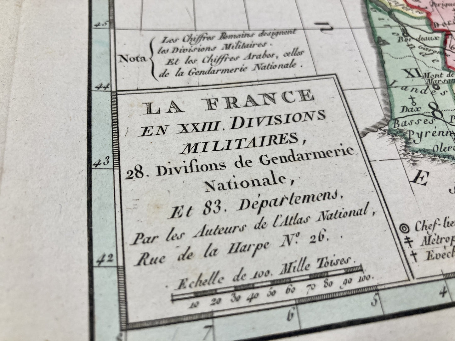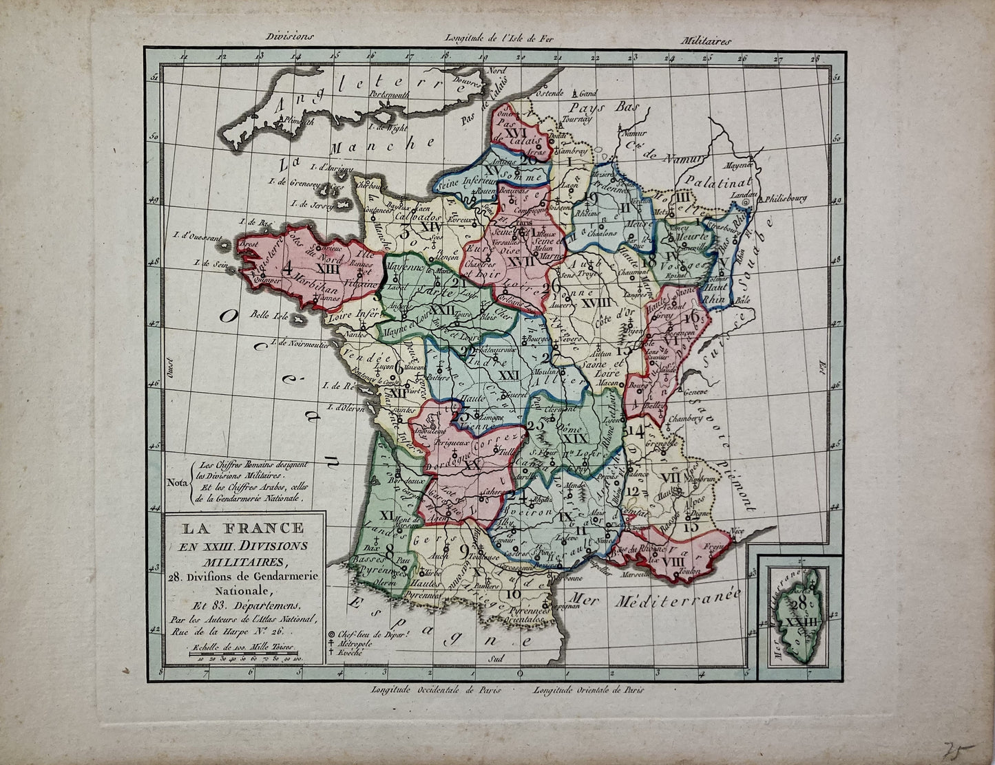 This antique map of France in 23rd military divisions, 28 National Gendarmerie divisions, and 83 departments dates from the end of the 18th century and its size is 28x22cm.