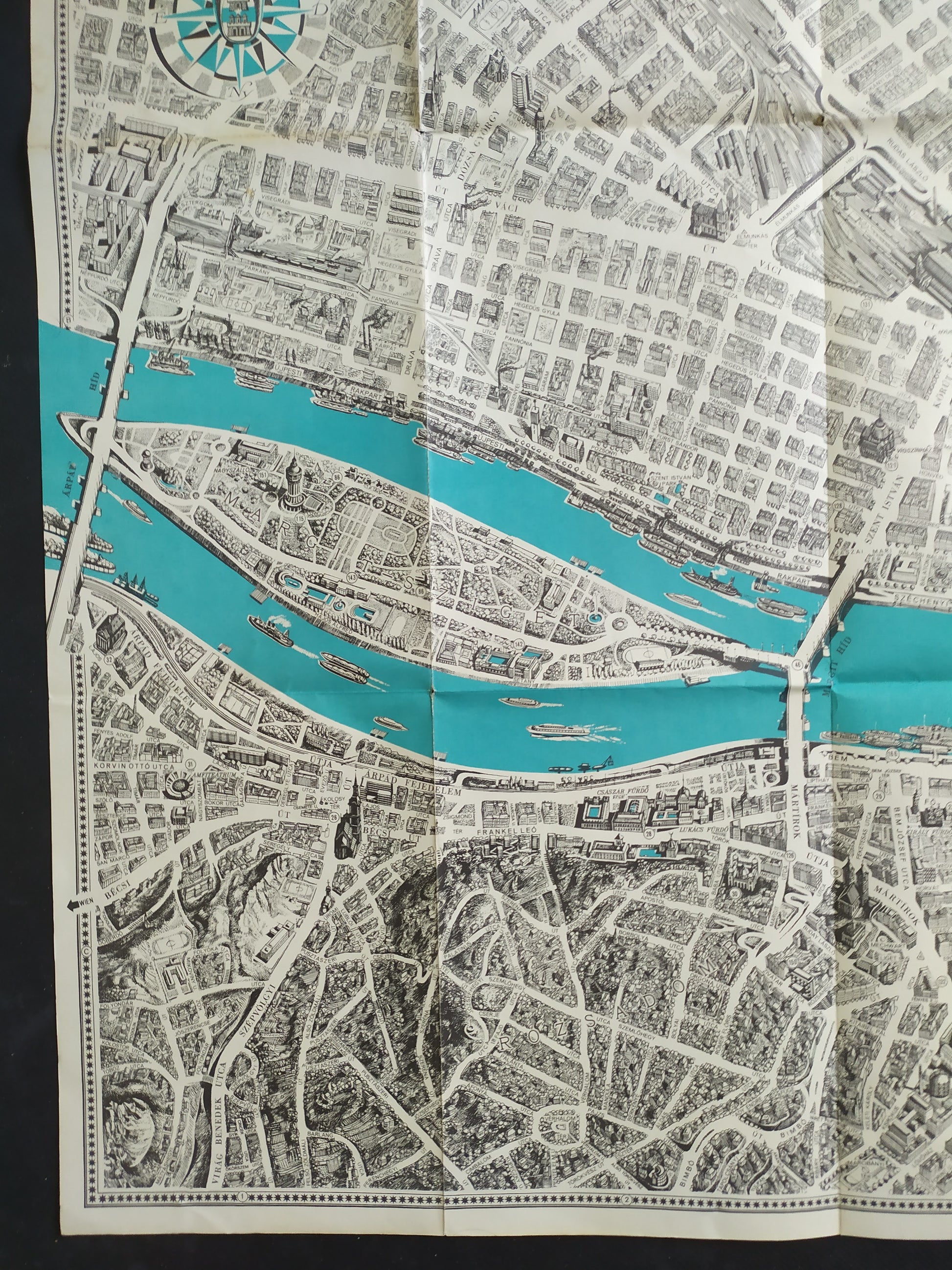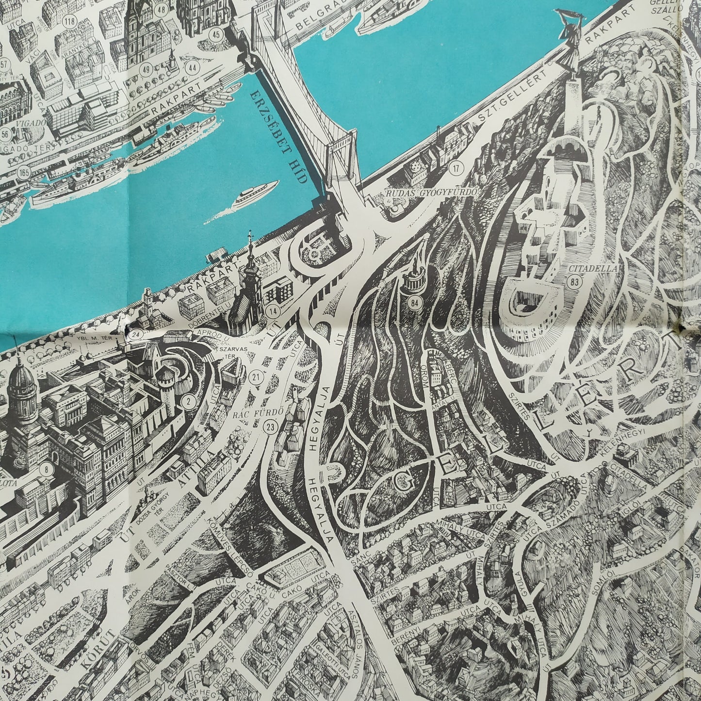 Created by István Mácsai in 1960, this perspective map of Budapest offers a detailed, hand-drawn representation of the city, crossed by the bright blue Danube. The contrast between the steep, densely illustrated districts of Buda to the south and the more regular, grid-like districts of Pest to the north is particularly marked. Monuments, bridges, avenues, and iconic buildings are precisely drawn. The compass rose and ornate cartouche in the upper left complete this large-scale artistic map, both utilitarian and decorative. Dimensions: 117 x 82 cm.