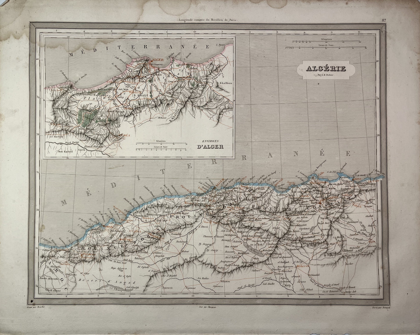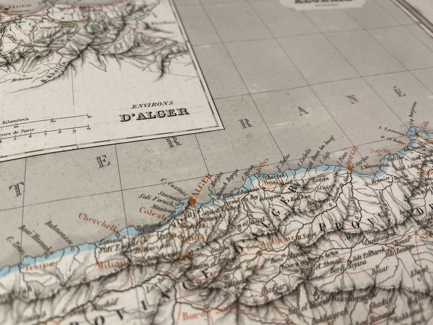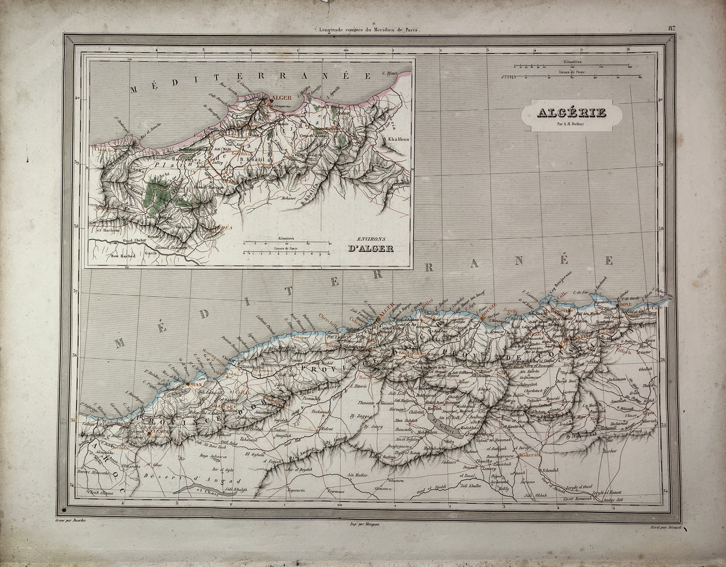 Cette carte ancienne de l'Algérie, pays du Nord de l'Afrique, est issue de l'Atlas des 86 départements et des Colonies françaises. Elle a été réalisée par le Géographe Auguste-Henri Dufour et imprimée au cours du XIXè siècle. Sa dimension est de 41x32cm.