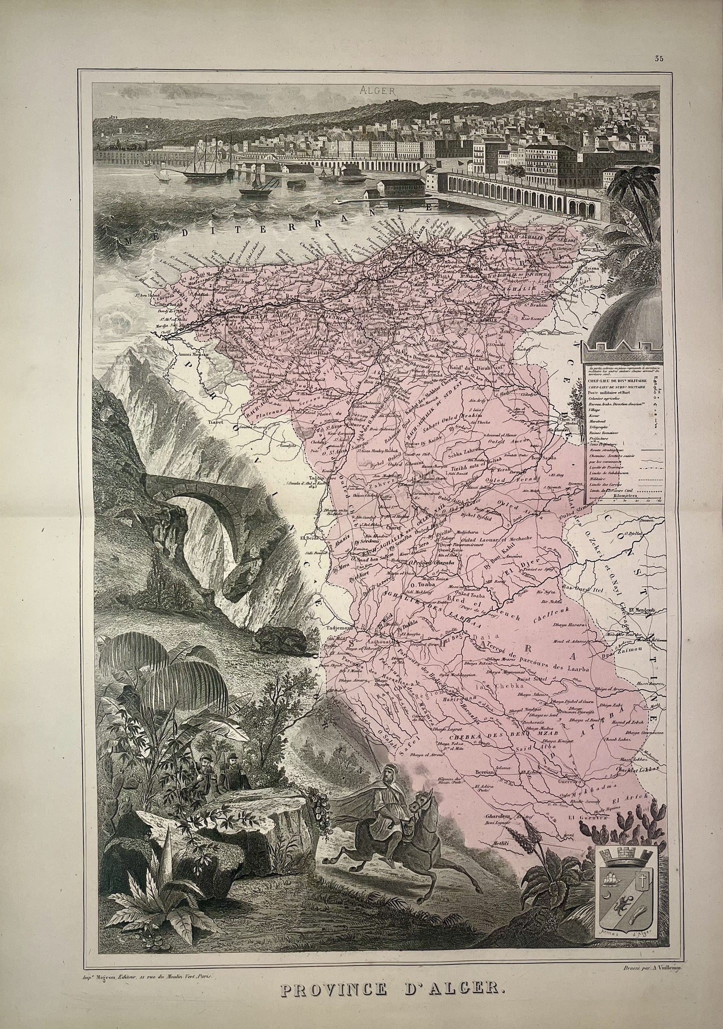 Cette carte ancienne de l'Algérie, pays du Maghreb, représente la Province d'Alger. Elle est issue de l'Atlas La France et ses Colonies, édité par J. Migeon à la fin du XIXè siècle et sa dimension est de 49x34,5cm. Elle est ornée de belles illustrations représentant les Hommes, la faune et la flore du pays.