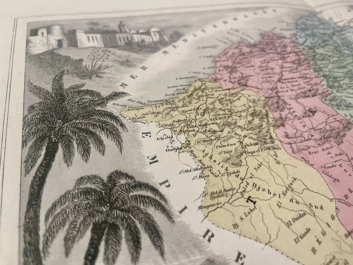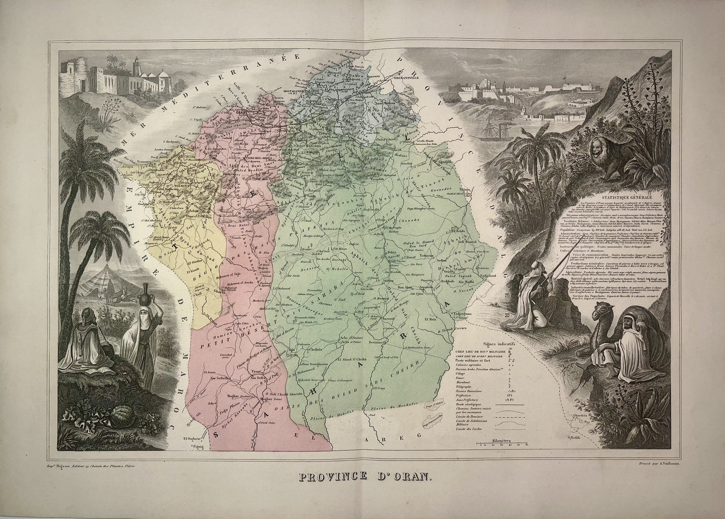 Cette carte ancienne de l'Algérie, pays du Maghreb, représente la Province d'Oran. Elle est issue de l'Atlas La France et ses Colonies, édité par J. Migeon à la fin du XIXè siècle et sa dimension est de 50x35,5cm. Elle est ornée de belles illustrations représentant les Hommes, la faune et la flore du pays.