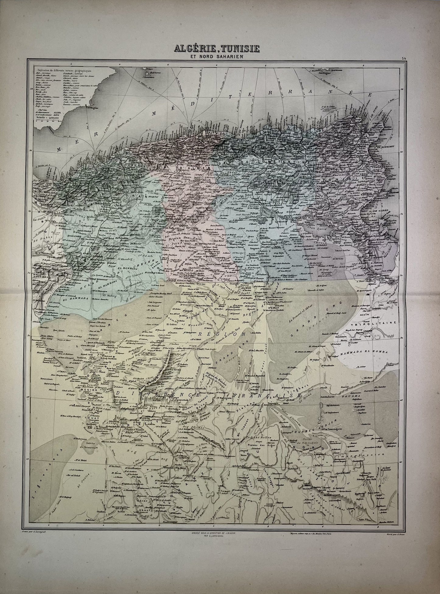 Cette carte ancienne de l'Algérie et la Tunisie et du Nord du Sahara est issue de l'Atlas Géographie Universelle, édité par J. Migeon à la fin du XIXè siècle et sa dimension est de 50x38cm.