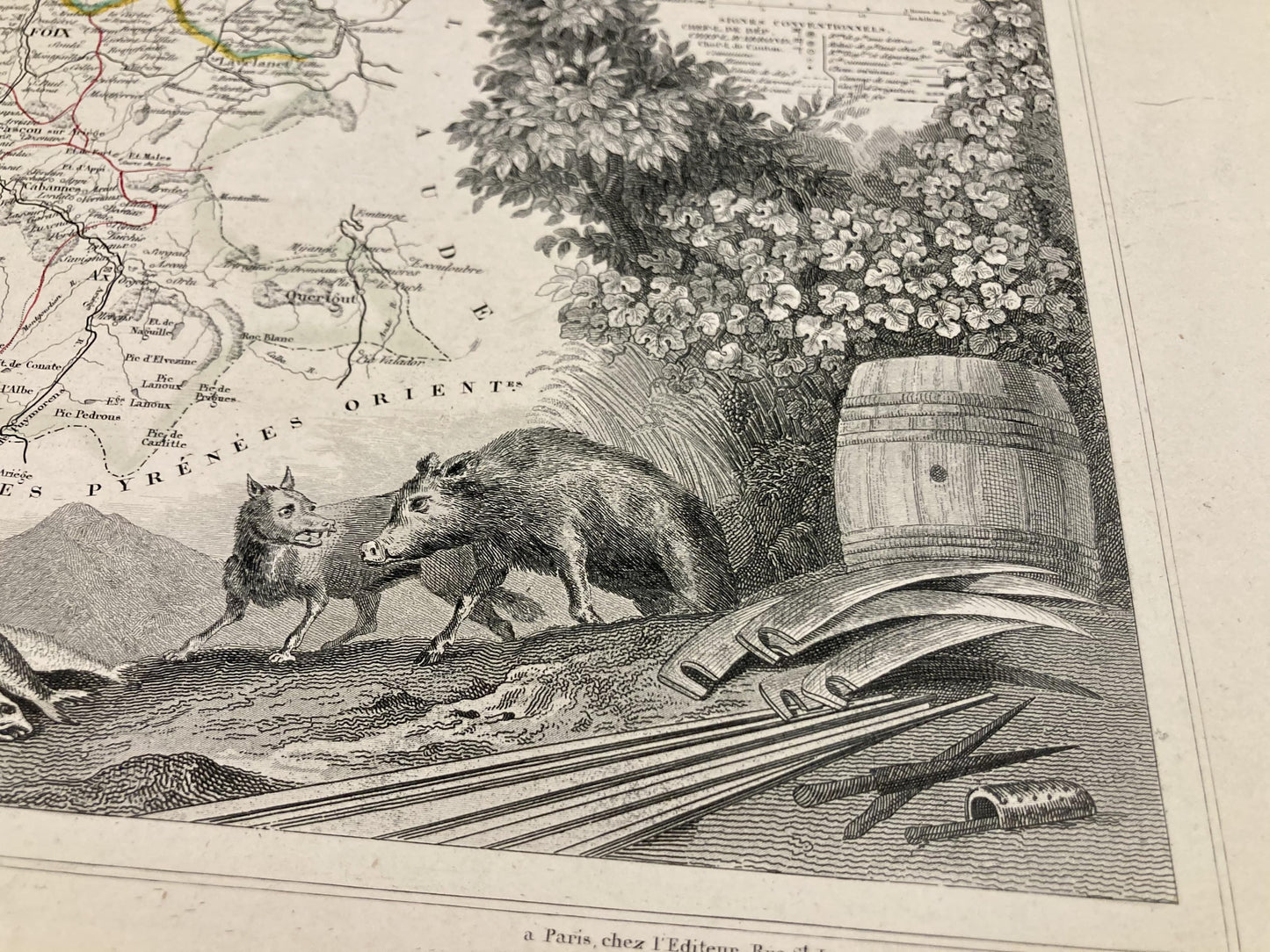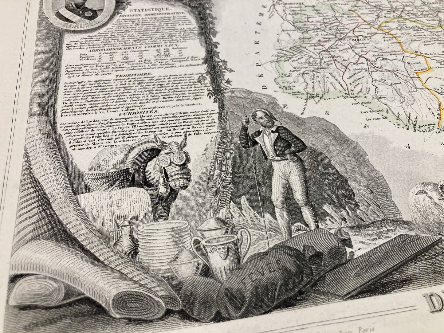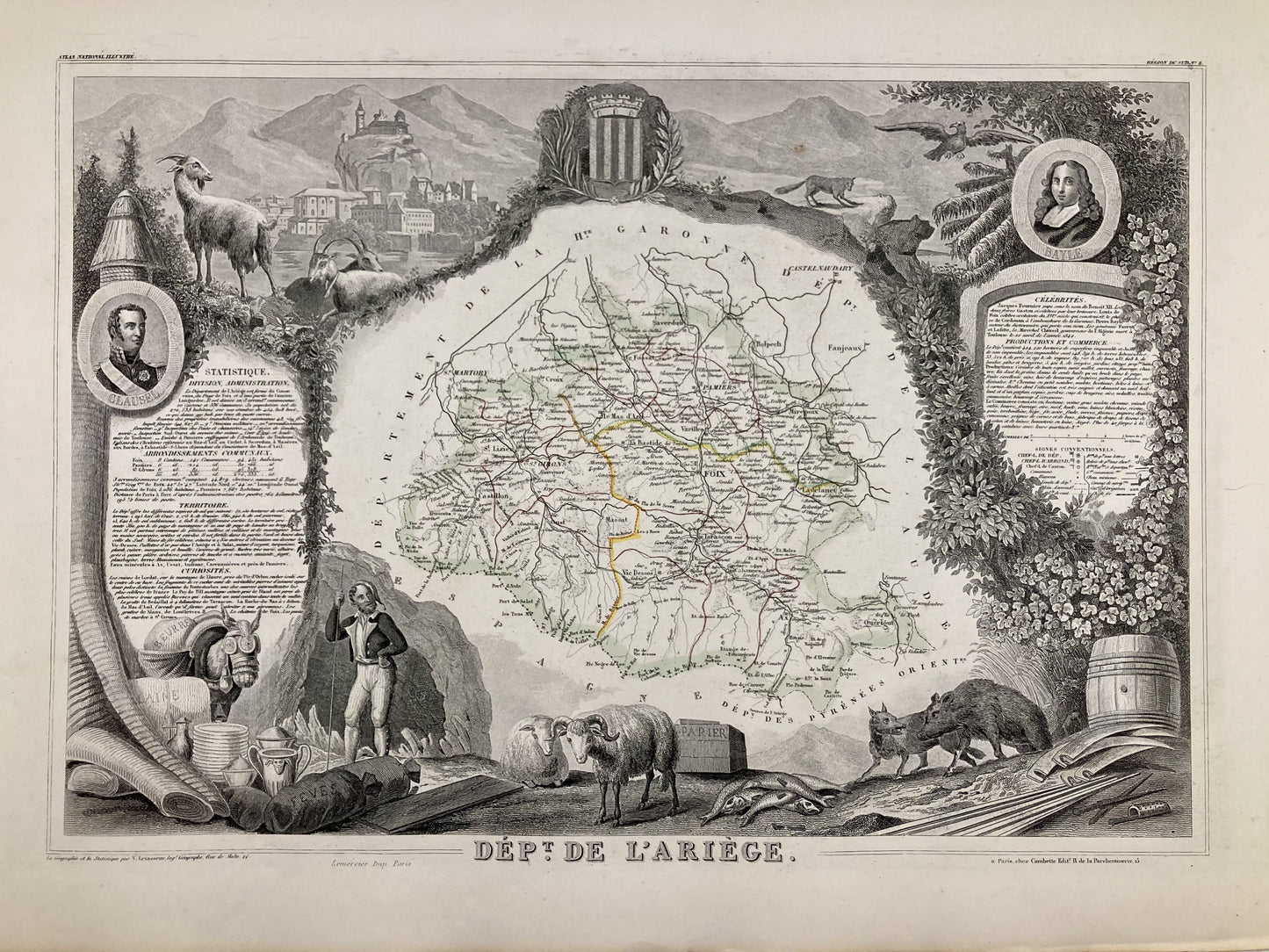Cette carte ancienne de l'Ariège est ornée d'illustrations représentant ses spécialités et quelques informations statistiques, historiques et économiques. Elle est issue de l'Atlas National Illustré et a été réalisée par le Géographe Victor Levasseur entre 1842 et 1872. Sa dimension est de 53x36cm (à 2cm près). On retrouve sur cette carte les villes et villages de l'Ariège de l'époque.