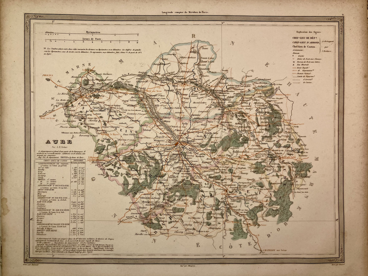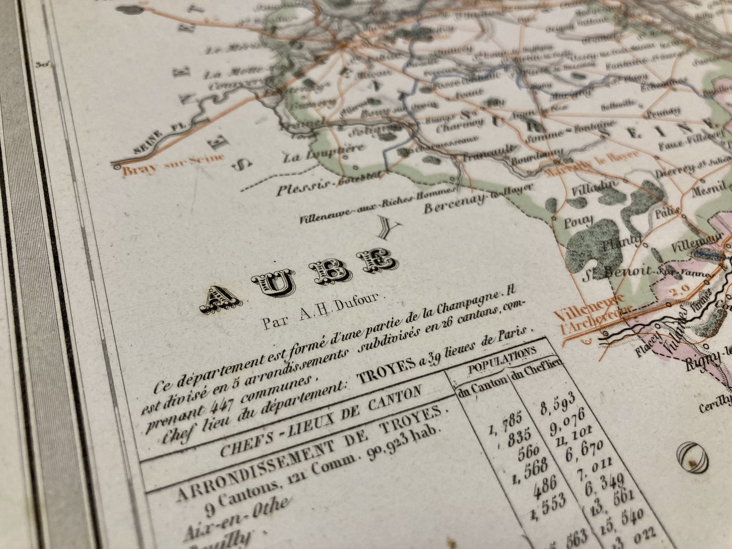 Cette carte ancienne de l'Aube accompagnée de quelques statistiques est issue de l'Atlas des 86 départements et des Colonies françaises. Elle a été réalisée par le Géographe Auguste-Henri Dufour et imprimée au cours du XIXè siècle. Sa dimension est de 41x32cm.