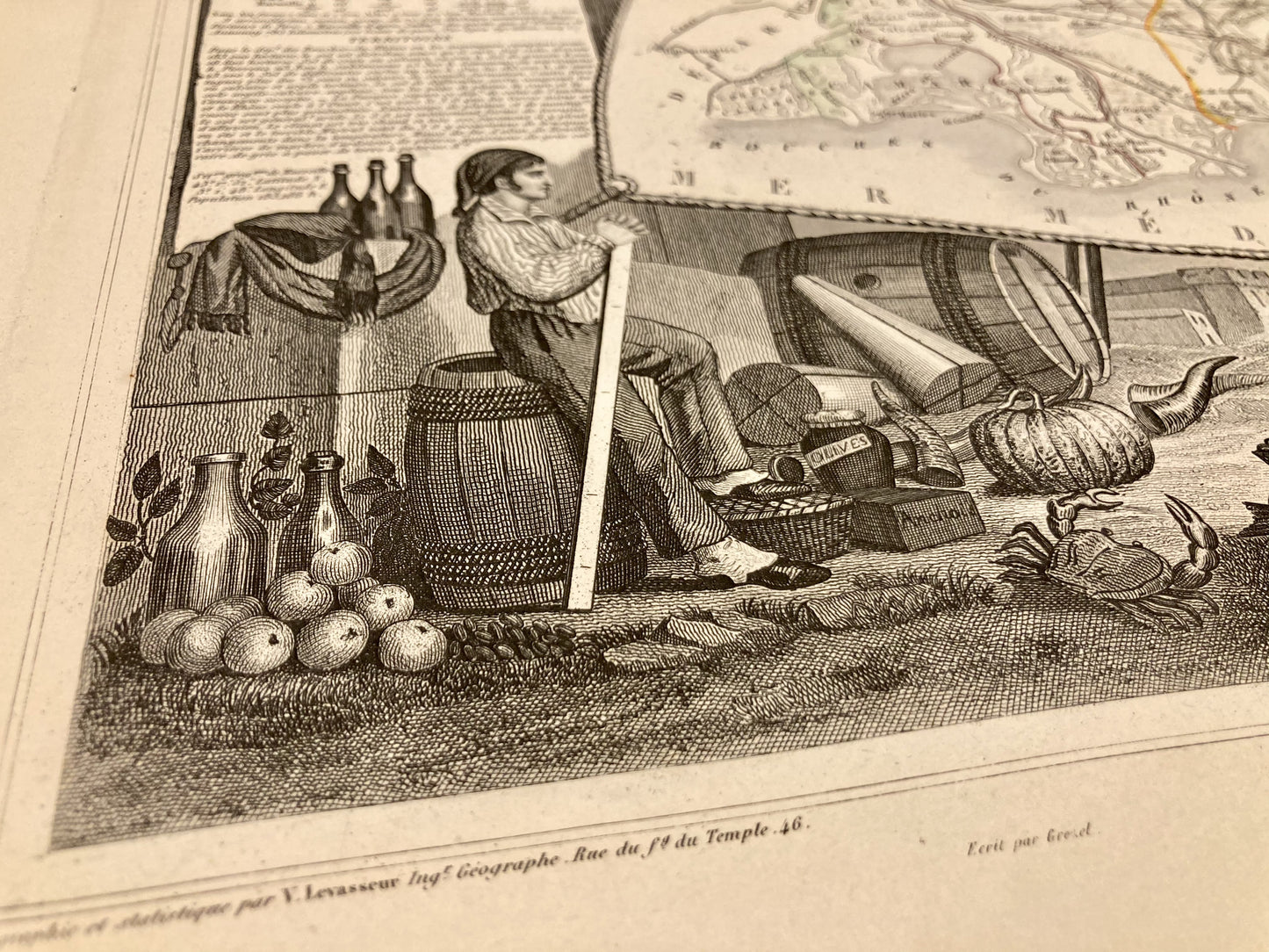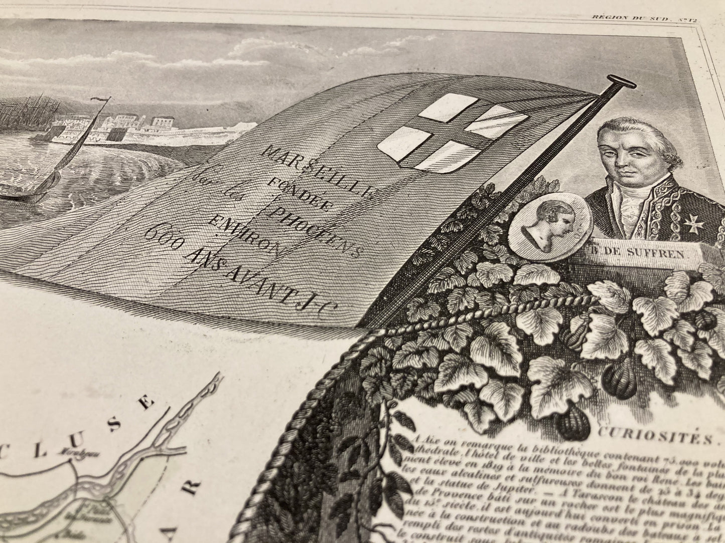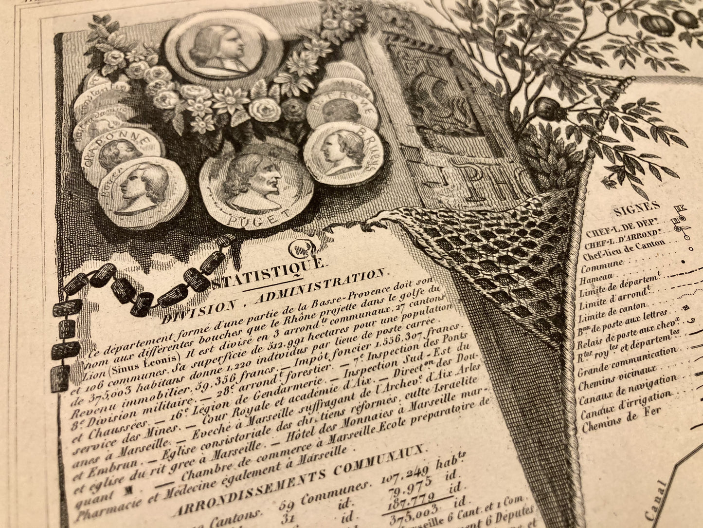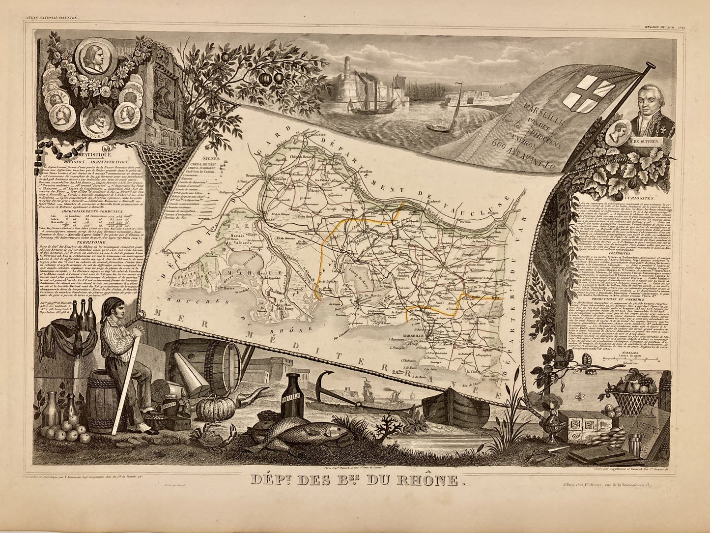 Cette carte ancienne des Bouches-du-Rhône est ornée d'illustrations représentant ses spécialités et quelques informations statistiques, historiques et économiques. Elle est issue de l'Atlas National Illustré et a été réalisée par le Géographe Victor Levasseur entre 1842 et 1872. Sa dimension est de 53x36cm (à 2cm près). On retrouve sur cette carte les villes et villages des Bouches-du-Rhône de l'époque.