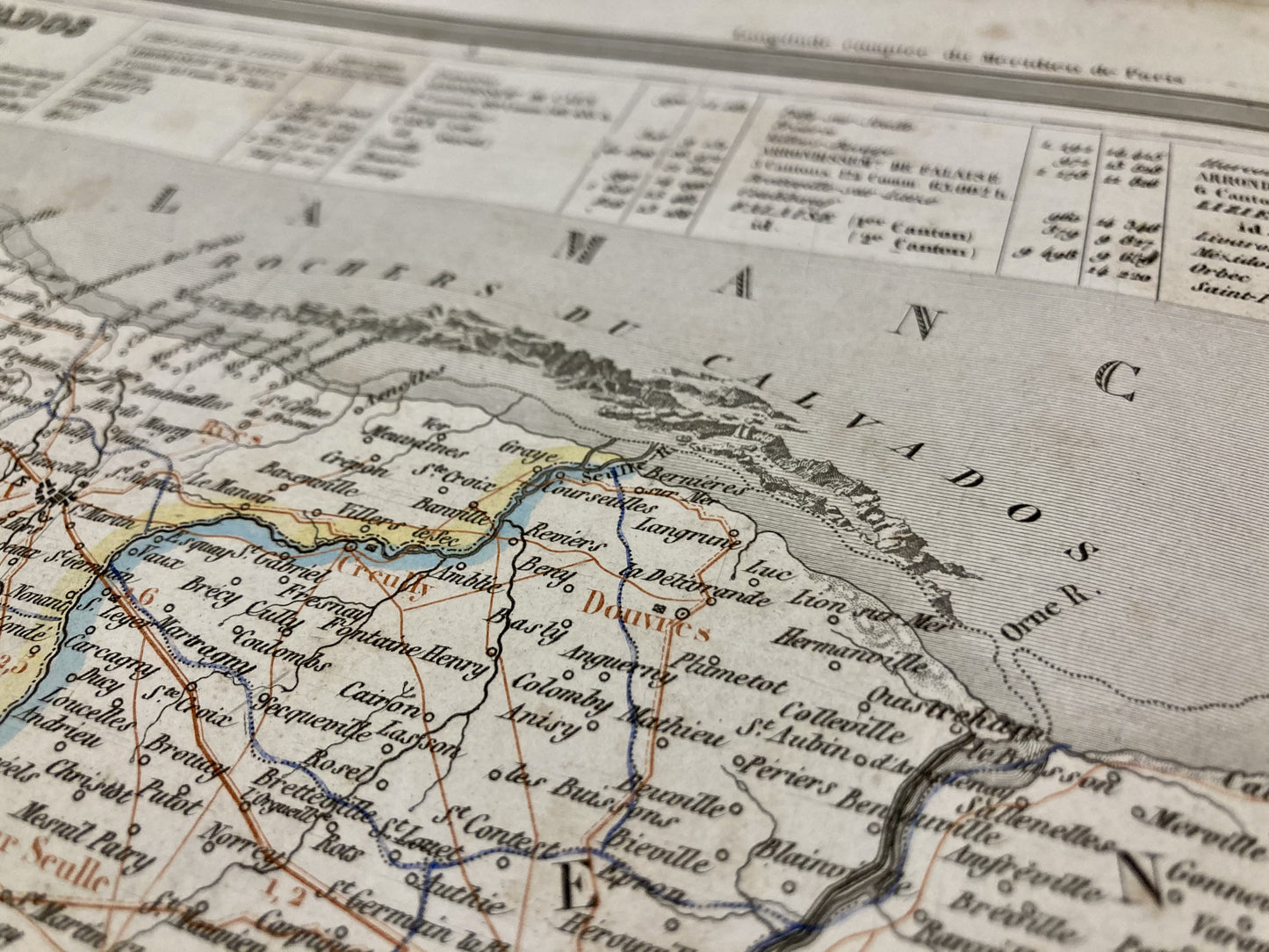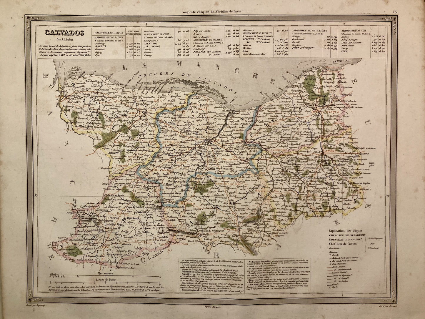Cette carte ancienne du Calvados accompagnée de quelques statistiques est issue de l'Atlas des 86 départements et des Colonies françaises. Elle a été réalisée par le Géographe Auguste-Henri Dufour et imprimée au cours du XIXè siècle. Sa dimension est de 41x32cm.