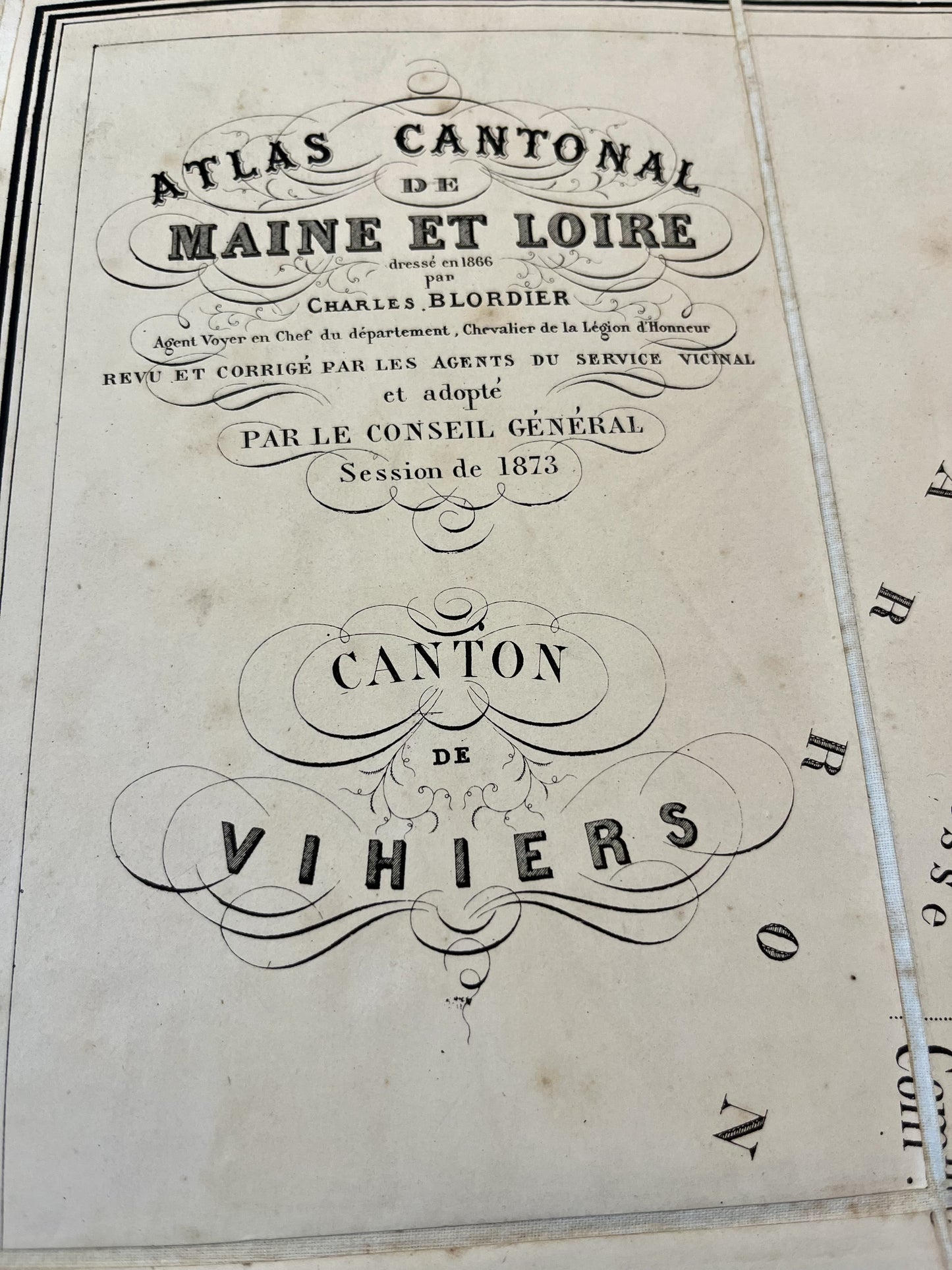 Cette carte ancienne entoilée du Canton de Vihiers est issue de l'Atlas Cantonal de Maine-et-Loire et a été dressée par Charles Blordier. Elle est datée de 1873 et sa dimension dépliée est de 82x62,5cm.