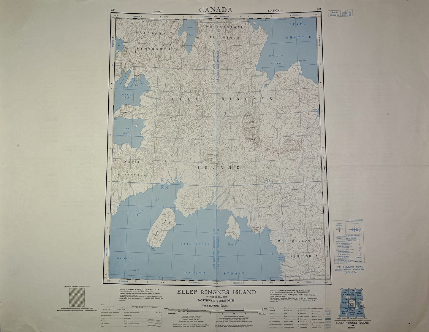 Cette carte ancienne du Canada représente l'Île Ellef Ringnes, située dans les Territoires du Nord-Ouest. Elle a été publiée par le Service Topographique de l'Armée Canadien en 1964 et sa dimension est de 73x57cm.
