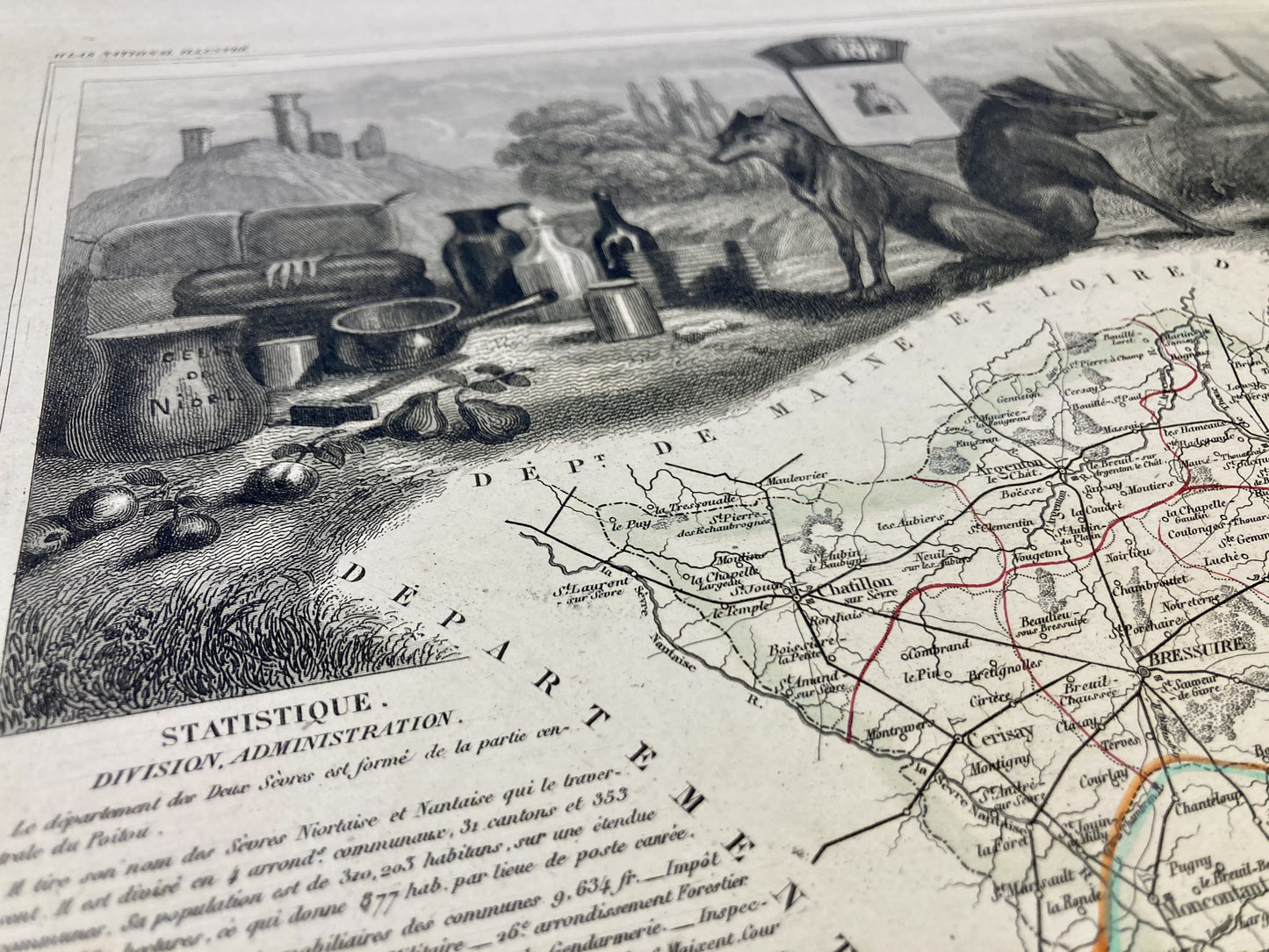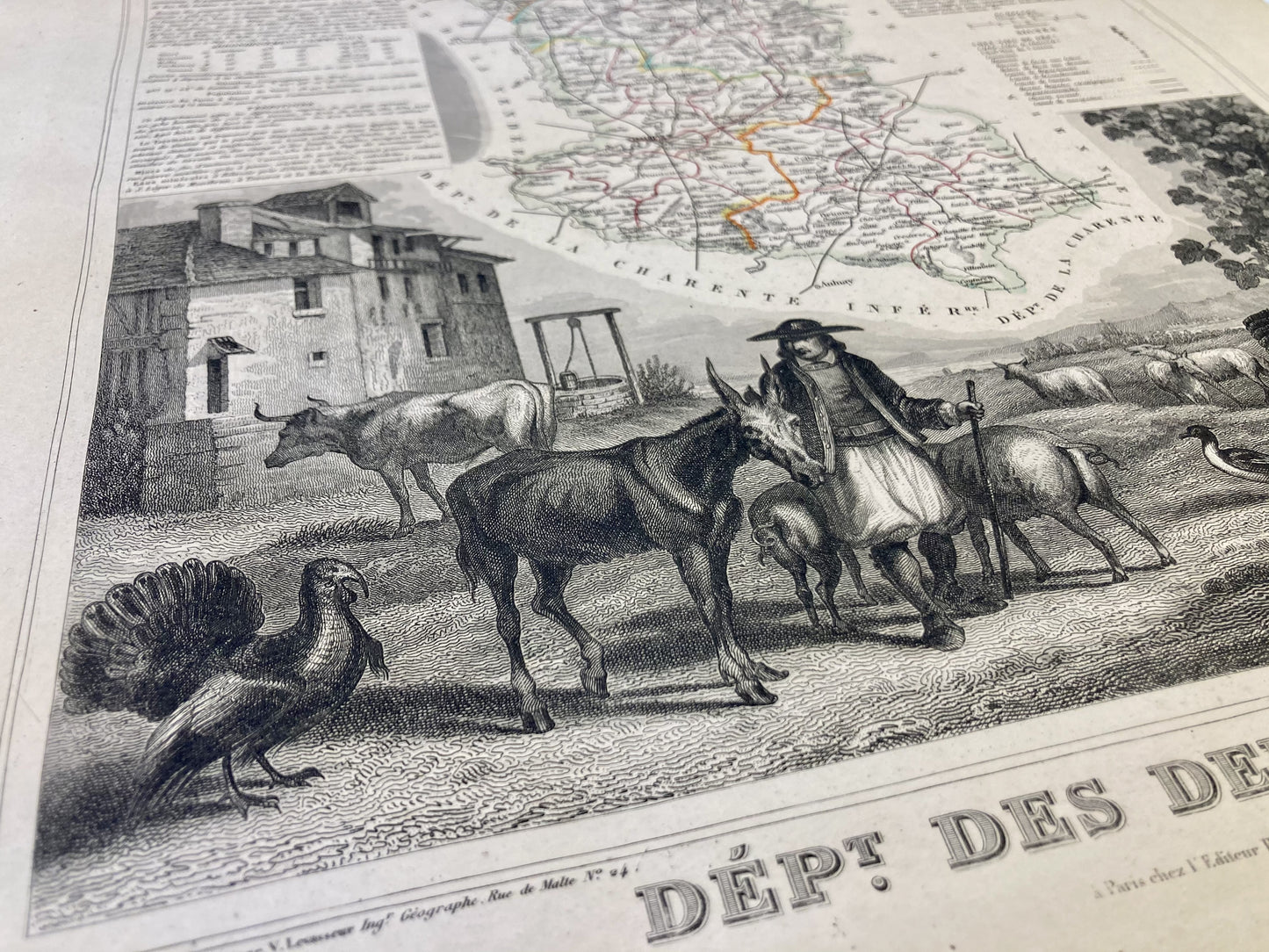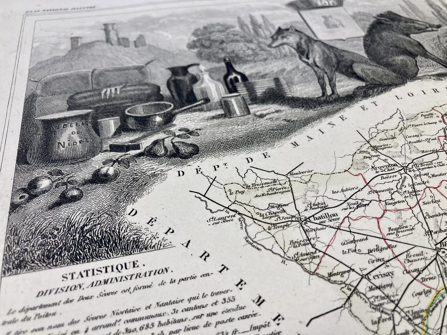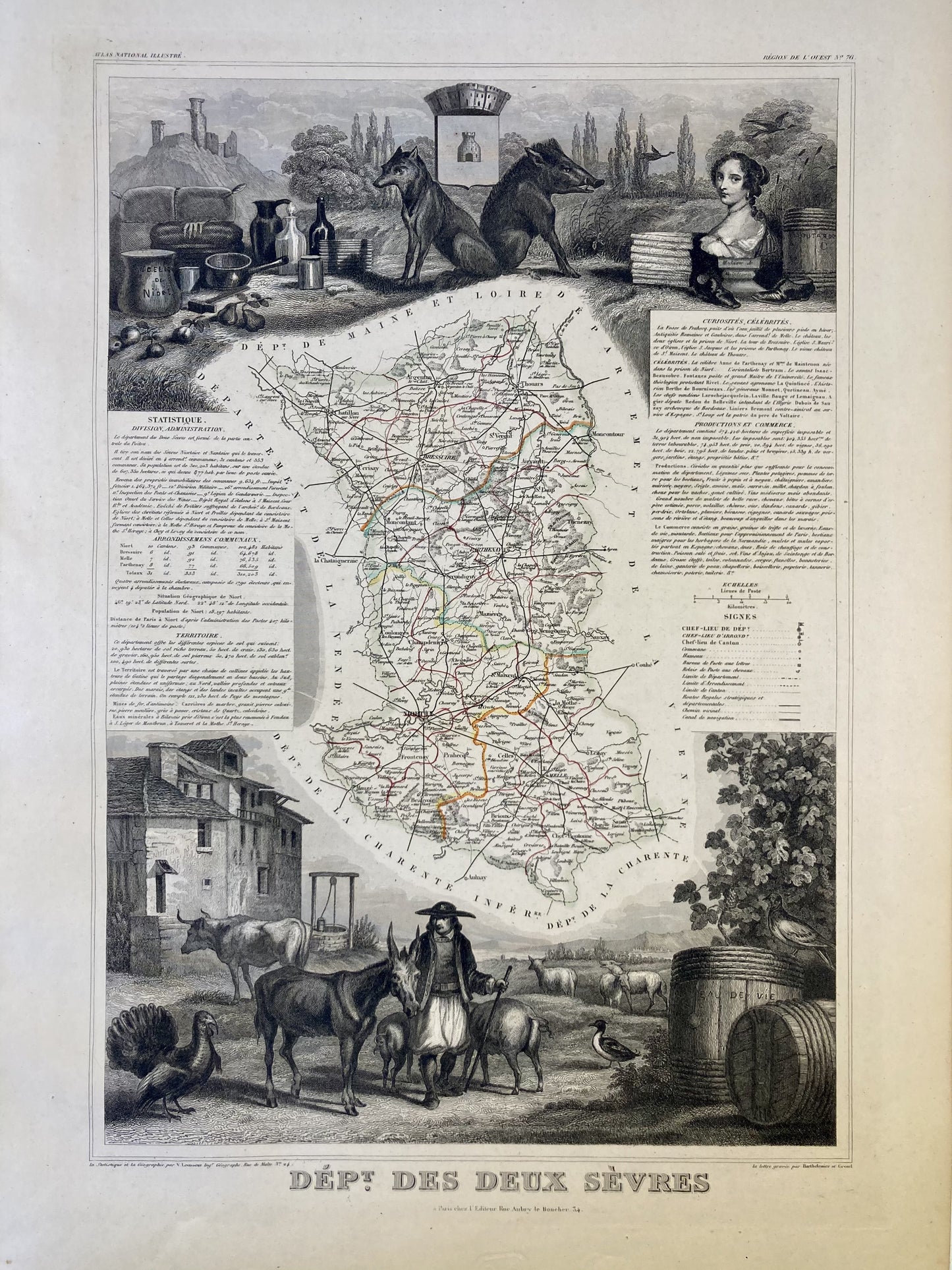 Cette carte ancienne des Deux-Sèvres est ornée d'illustrations représentant ses spécialités et quelques informations statistiques, historiques et économiques. Elle est issue de l'Atlas National Illustré et a été réalisée par le Géographe Victor Levasseur entre 1842 et 1872. Sa dimension est de 53x36cm (à 2cm près). On retrouve sur cette carte les villes et villages des Deux-Sèvres de l'époque.