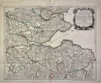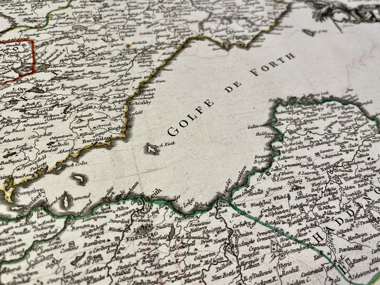 Cette carte ancienne de l'Ecosse représentant les environs d'Edimbourg a été réalisée par James Dorret et publiée au sein de l'Atlas Britannique par son arrière-petit-fils, Didier Robert de Vaugondy, en 1778. Sa dimension est de 65x53cm.