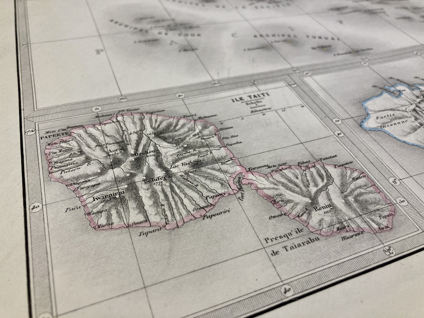 Cette carte ancienne représentant les établissements français de l'Océanie (Tahiti, Marquises, Tuamotu, Cook, Hiva-Hoa, Nouka-Hiva, Société) a été éditée par la Librairie Abel Pilon & Cie. Elle date de la fin du XIXè siècle et sa dimension est de 43,5x36cm.