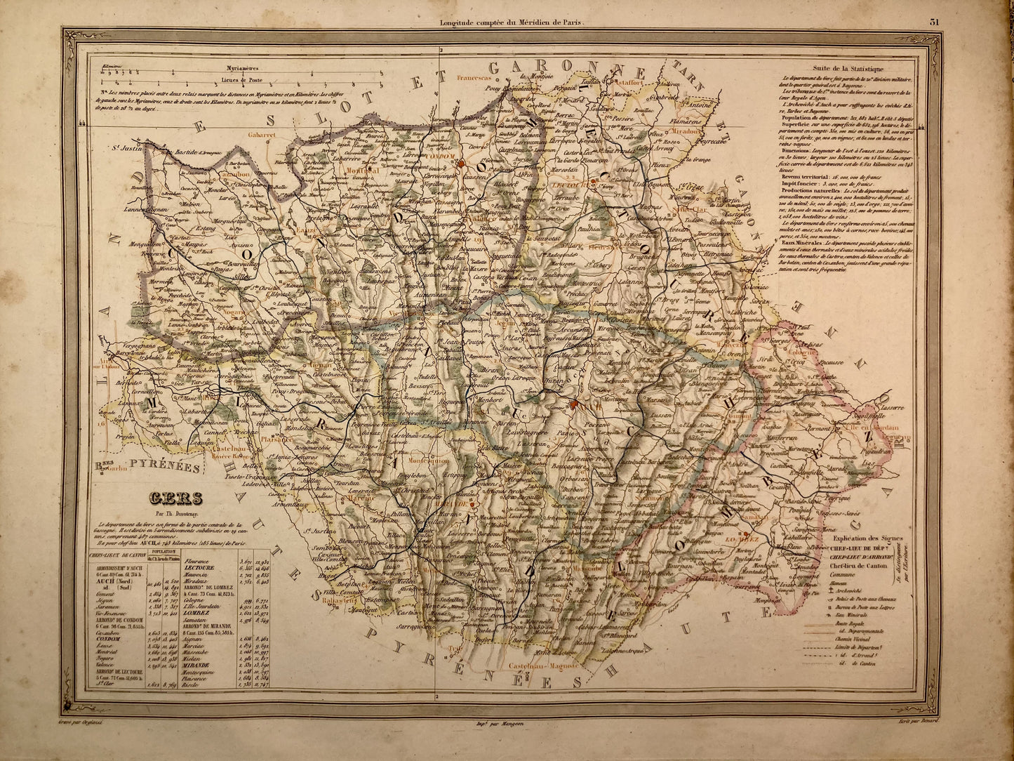 Cette carte ancienne du Gers accompagnée de quelques statistiques est issue de l'Atlas des 86 départements et des Colonies françaises. Elle a été réalisée par le Géographe Auguste-Henri Dufour et imprimée au cours du XIXè siècle. Sa dimension est de 41x32cm.