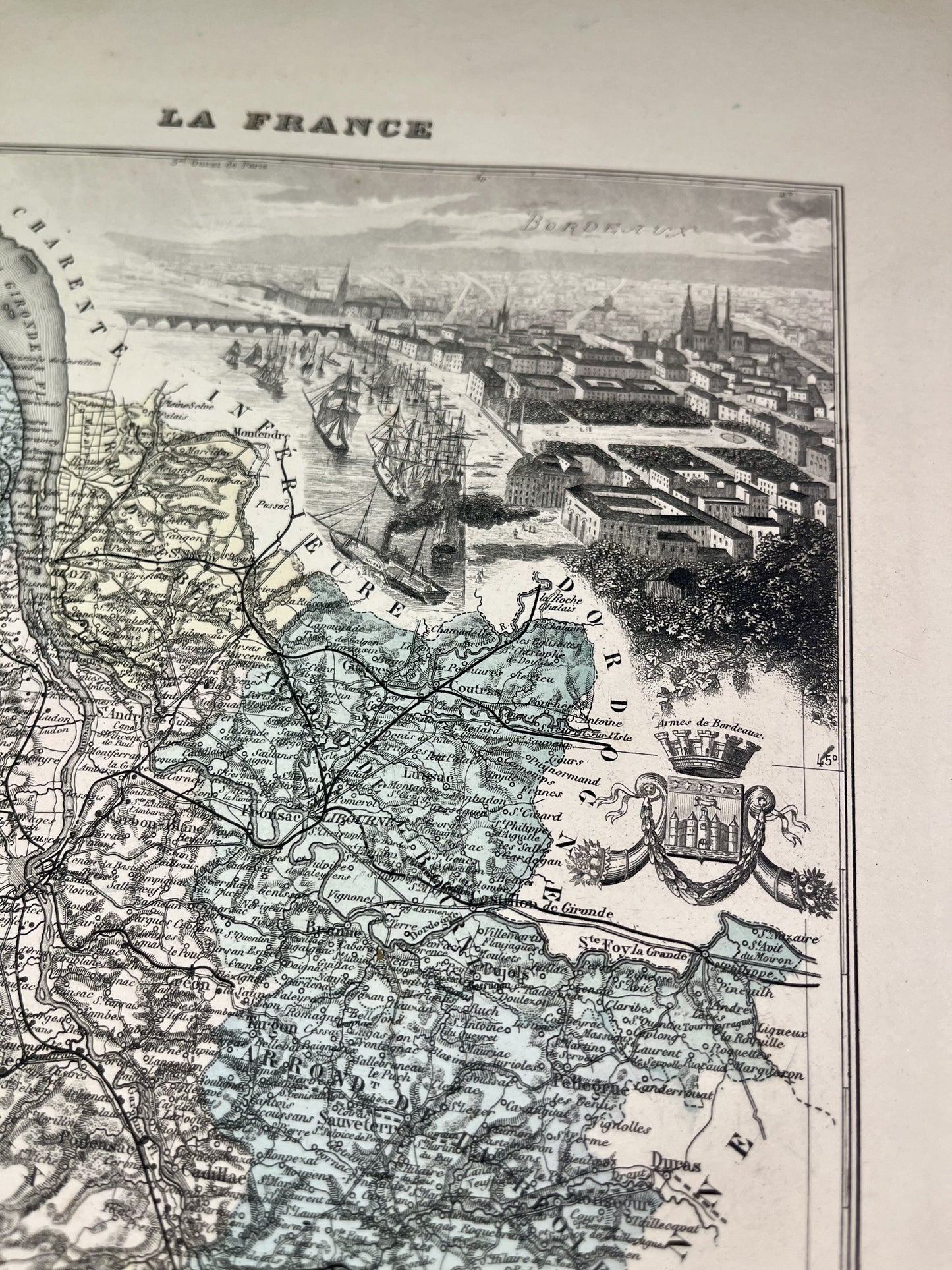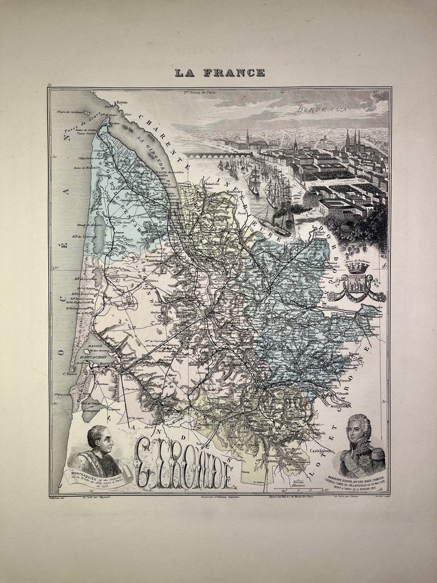 Cette carte ancienne de la Gironde est colorée et ornée d'illustrations représentant des personnages illustres du département ainsi qu'une vue de la ville de Bordeaux. Elle est issue du Nouvel Atlas National Illustré, ouvrage édité durant la fin du XIXe siècle et le début du XXe, et a été réalisée par les Géographes A. Vuillemin, L. Thuillier, Ch. Lacoste et G. Lorsignol. Sa dimension est de 39x29cm. On retrouve sur cette carte les villes et villages de la Gironde de l'époque.