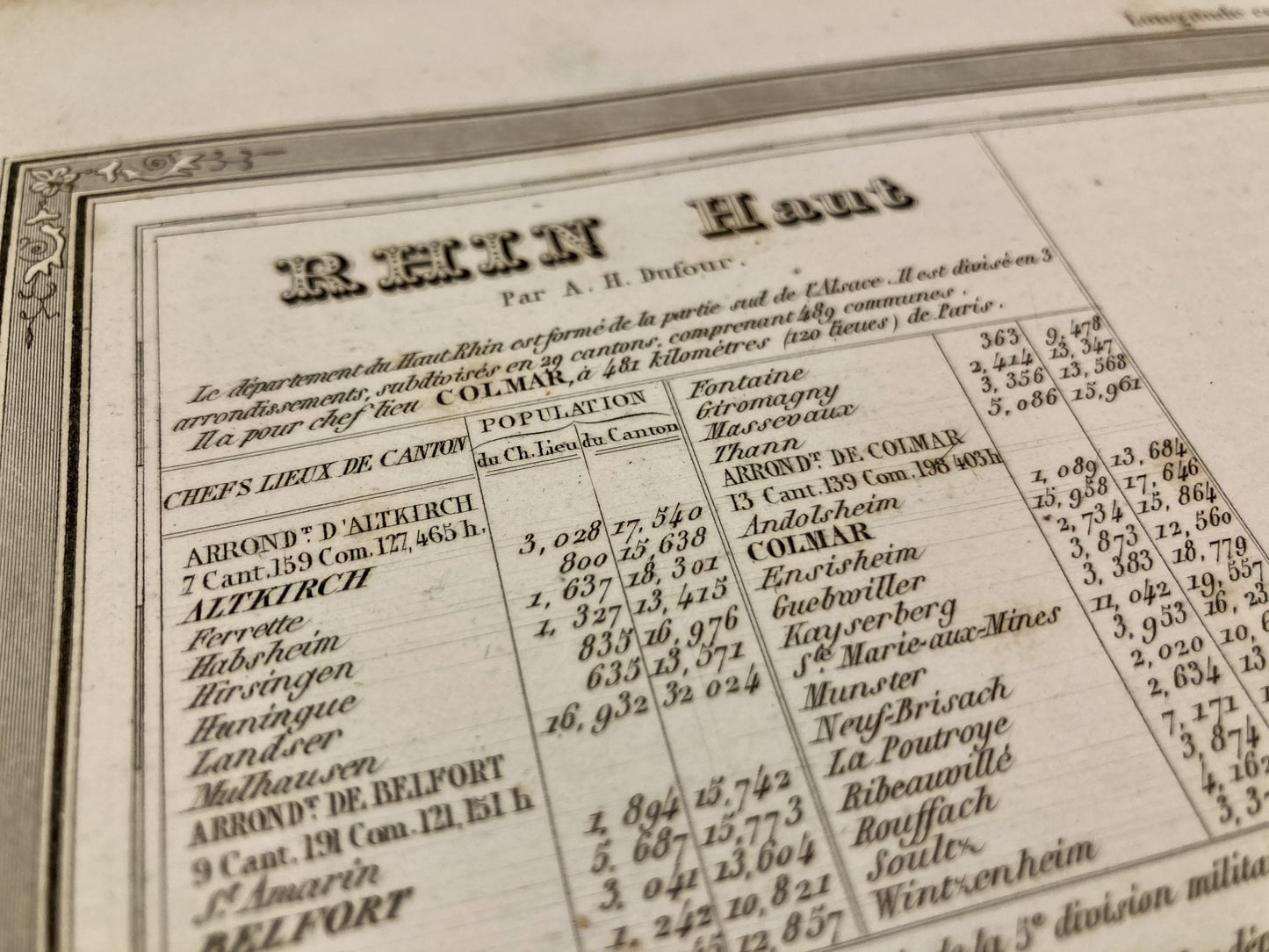 Cette carte ancienne du Haut-Rhin accompagnée de quelques statistiques est issue de l'Atlas des 86 départements et des Colonies françaises. Elle a été réalisée par le Géographe Auguste-Henri Dufour et imprimée au cours du XIXè siècle. Sa dimension est de 41x32cm.