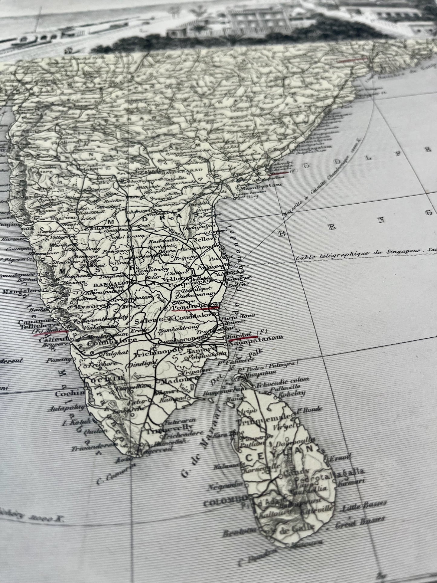 Cette carte ancienne de l'Inde est colorée et représente les établissements français de l'Inde. Elle est issue du Nouvel Atlas National Illustré, ouvrage édité durant la fin du XIXe siècle et le début du XXe, et a été réalisée par les Géographes A. Vuillemin, L. Thuillier, Ch. Lacoste et G. Lorsignol. Sa dimension est de 39x29cm.