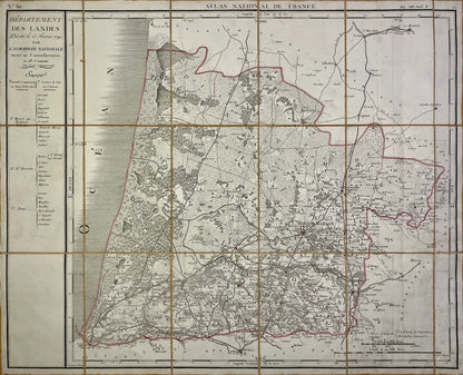 Cette carte ancienne du département des Landes est entoilée et a été réalisée par le géographe français Pierre-Gilles Chanlaire au début du XIXe siècle. Elle est issue de l'Atlas National de France et sa dimension est de 66,5x54cm.