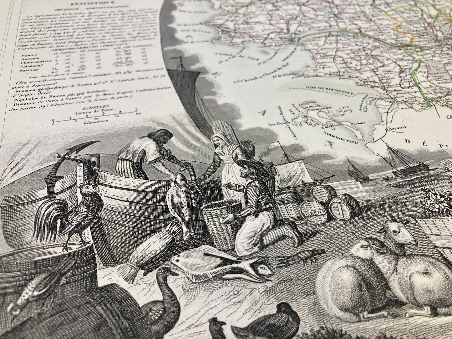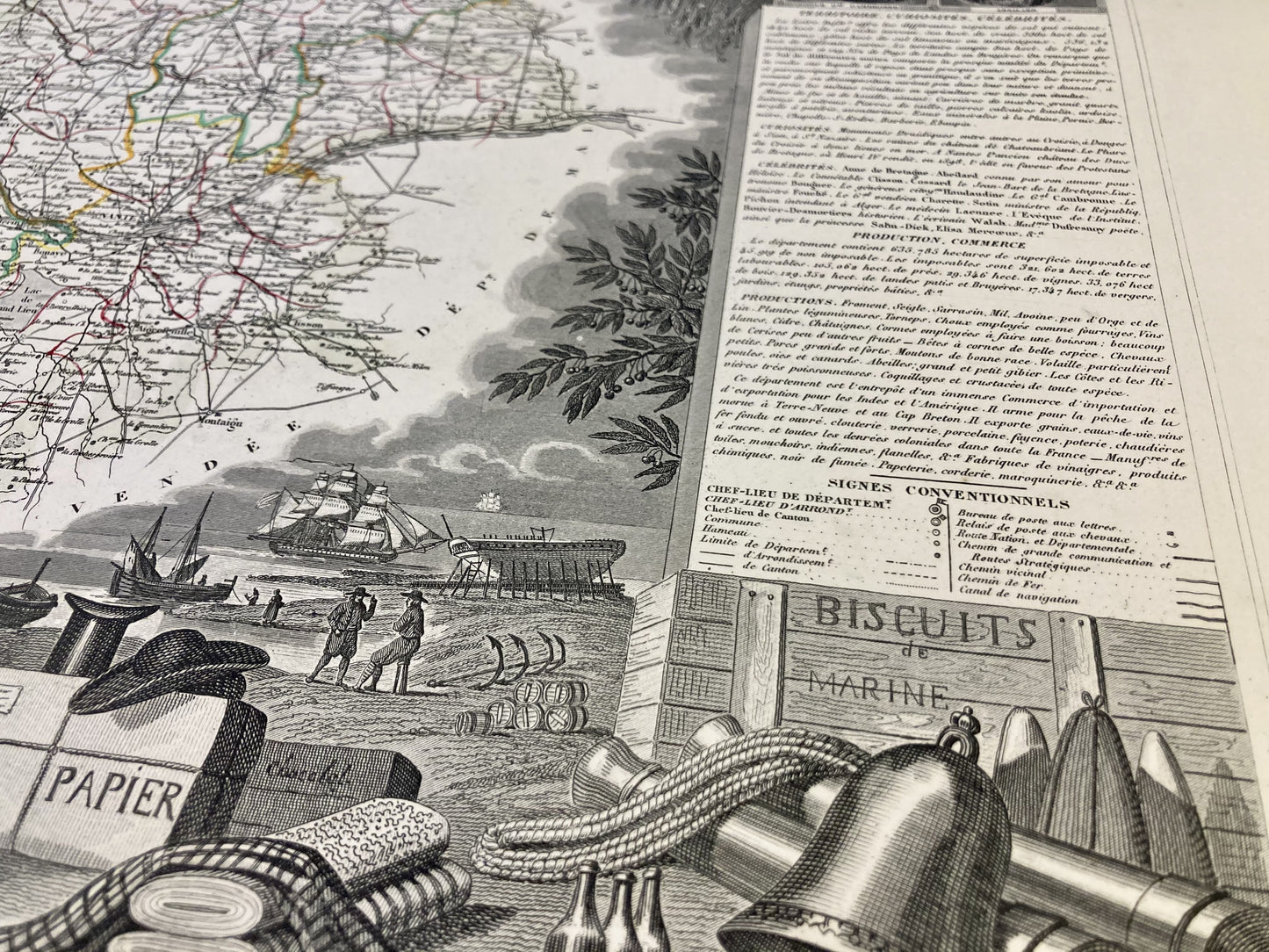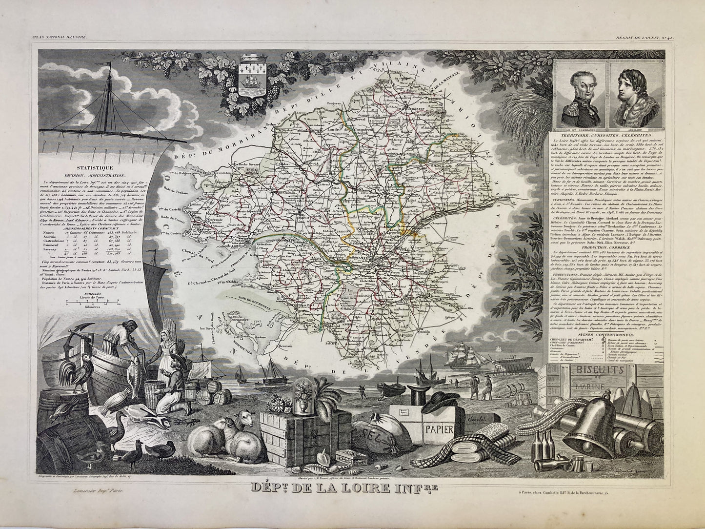 Cette carte ancienne de la Loire-Atlantique est ornée d'illustrations représentant ses spécialités et quelques informations statistiques, historiques et économiques. Elle est issue de l'Atlas National Illustré et a été réalisée par le Géographe Victor Levasseur entre 1842 et 1872. Sa dimension est de 53x36cm (à 2cm près). On retrouve sur cette carte les villes et villages de la Loire-Atlantique de l'époque.