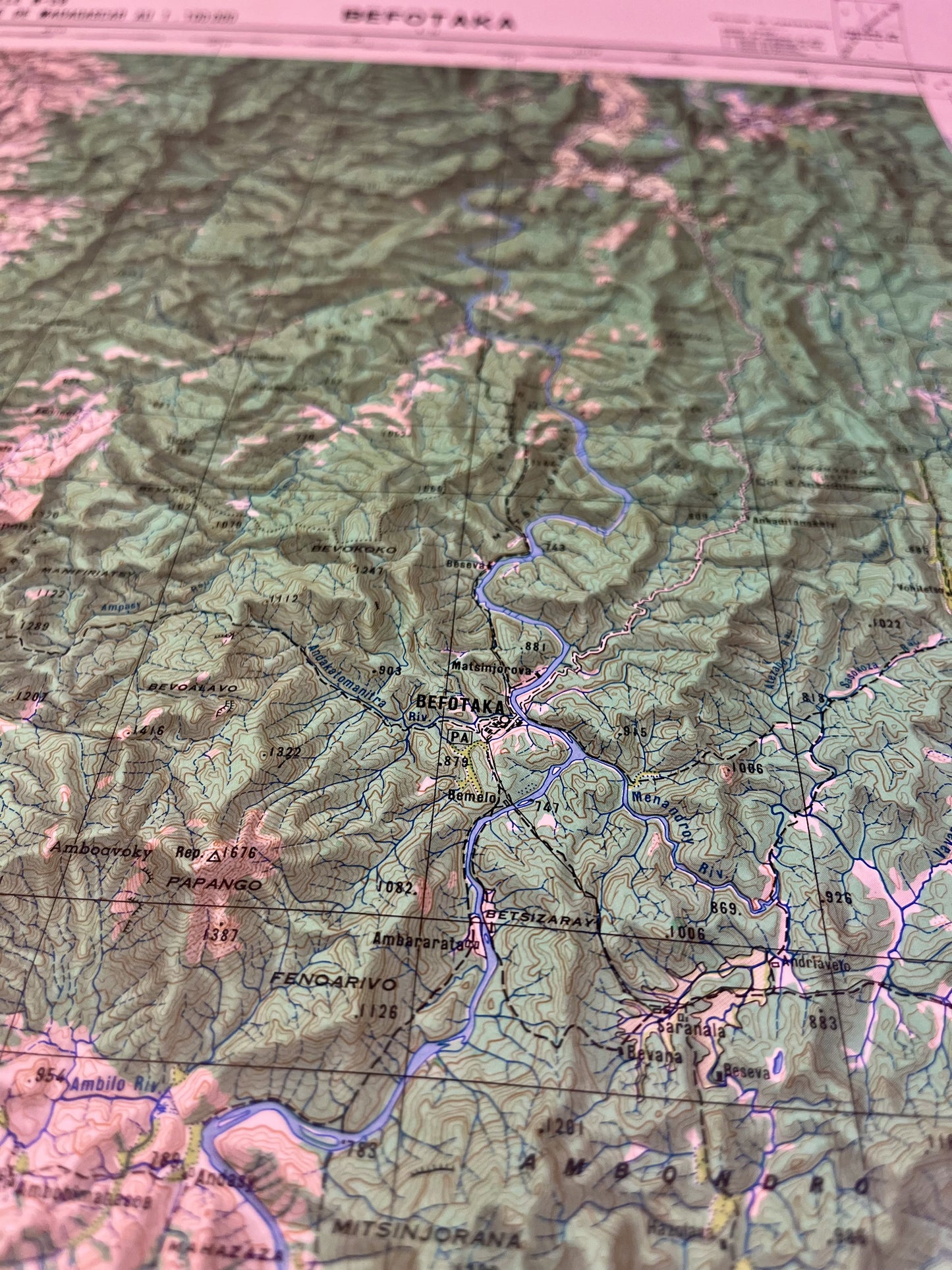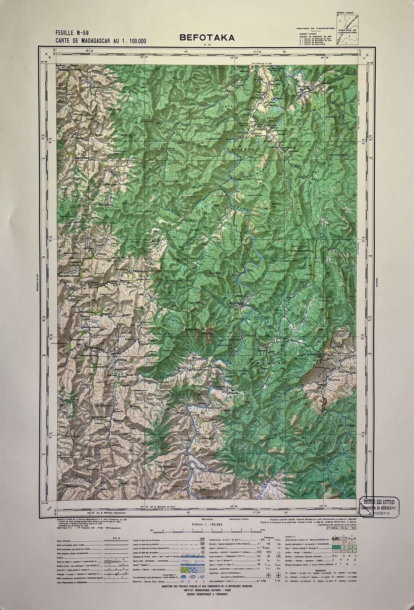 Cette carte ancienne de Madagascar, île au large de l'Afrique, représente la région de Befotaka. Elle a été réalisée par le Service Géographique de Madagascar en 1961 et sa dimension est de 63x42,5cm.