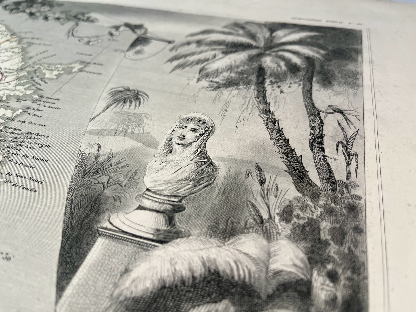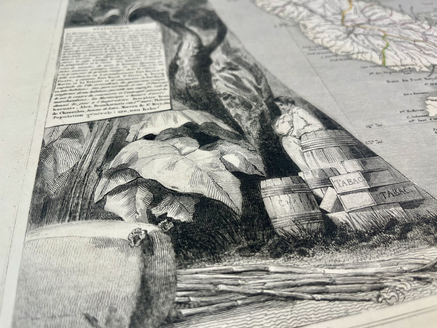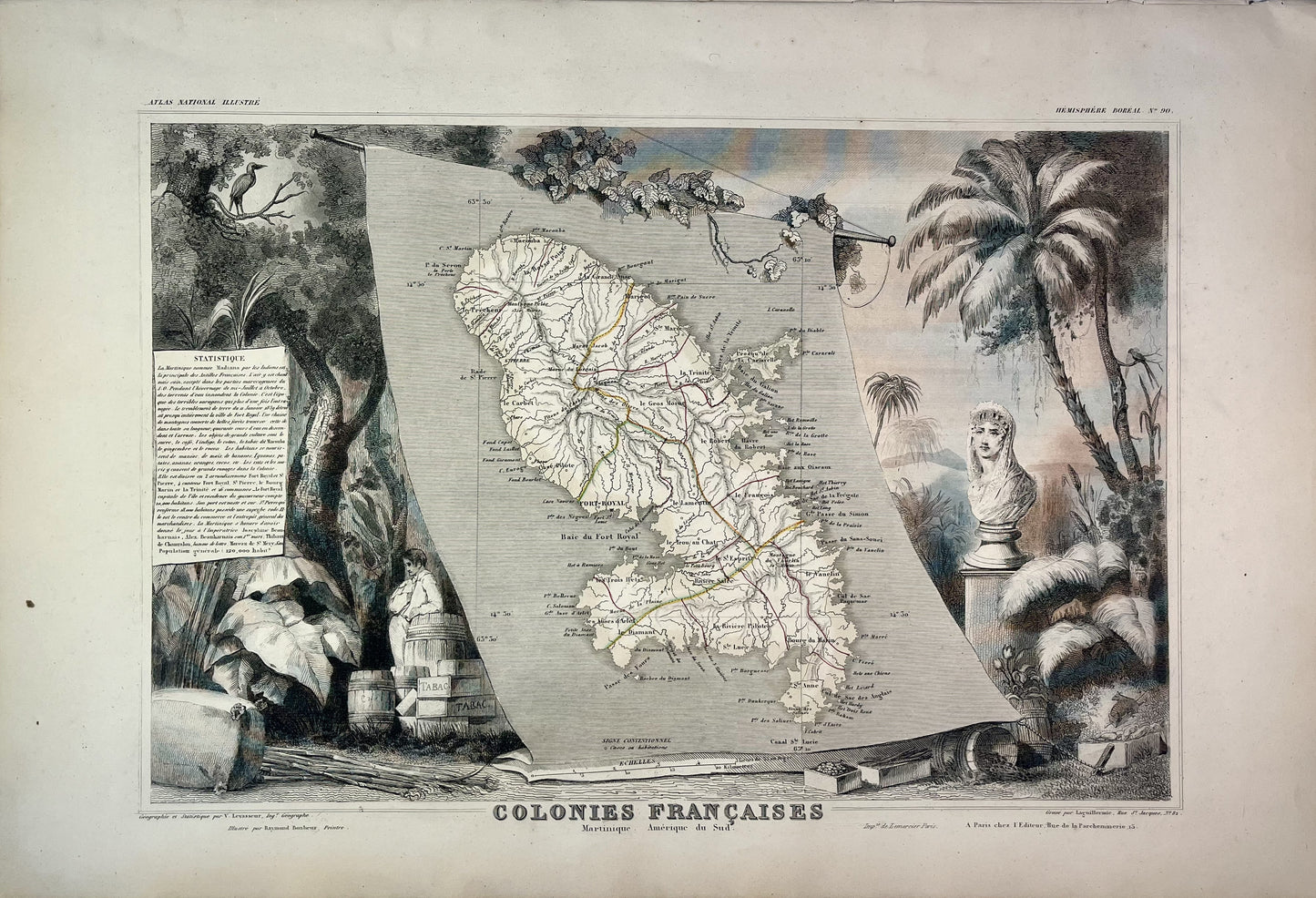 Cette carte ancienne de la Martinique est ornée d'illustrations représentant ses paysages et quelques informations statistiques. Elle issue de l'Atlas Universel Illustré et a été réalisée par le Géographe Victor Levasseur entre 1842 et 1872. Sa dimension est de 51x36cm. On retrouve sur cette carte ancienne les principales villes et anses de la Martinique telles que Fort-de-France (Fort-Royal), Saint-Pierre, le Lamentin, le Vauclin, le Diamant...