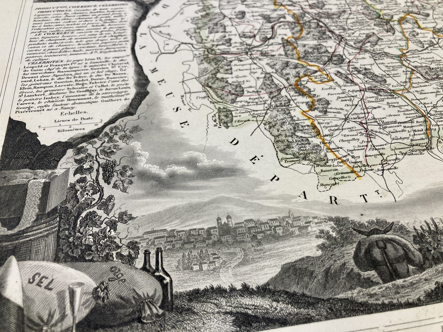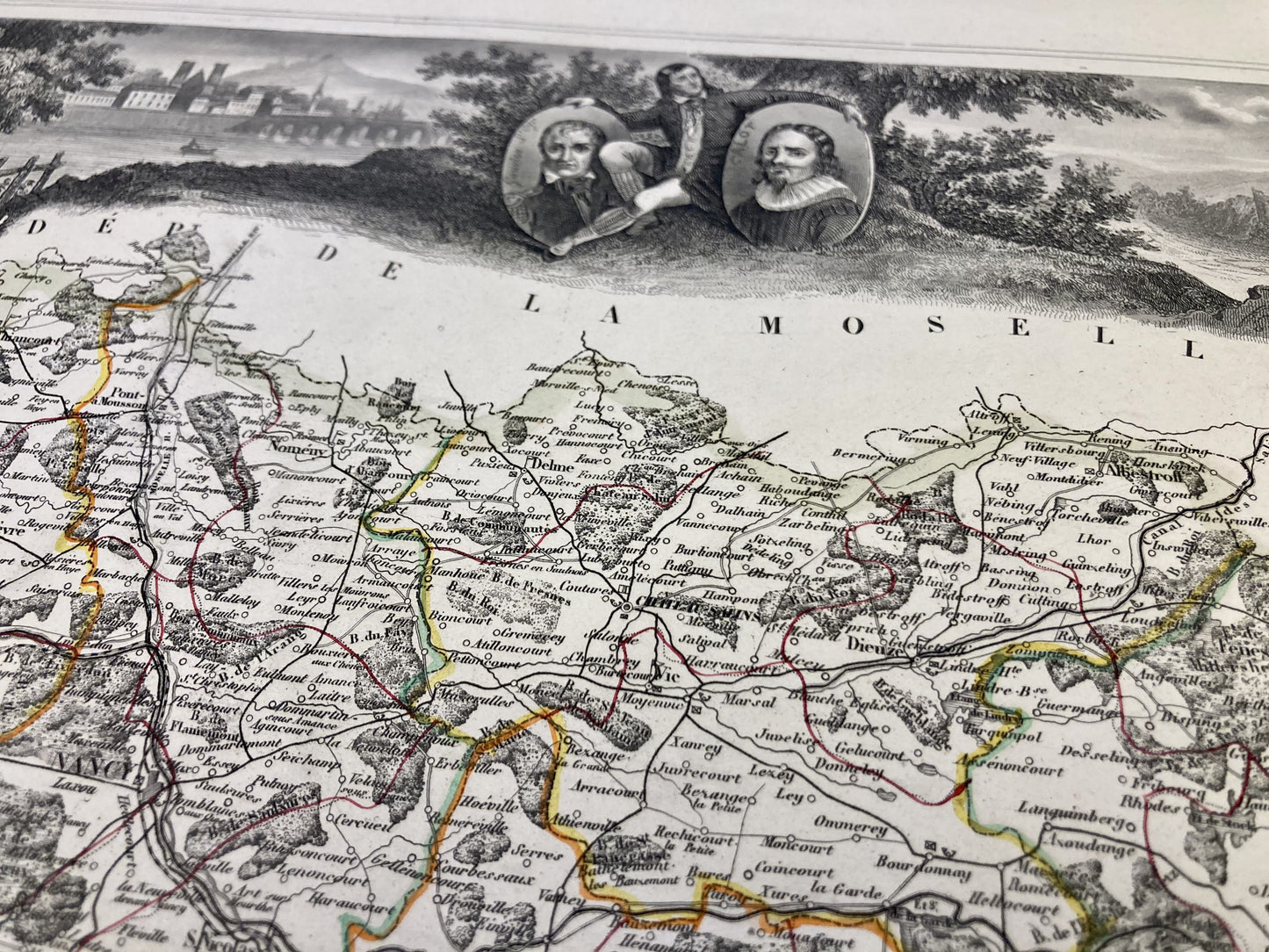 Cette carte ancienne de la Meurthe (ancien département, aujourd'hui à cheval entre la Meurthe-et-Moselle et la Moselle) est ornée d'illustrations représentant ses spécialités et quelques informations statistiques, historiques et économiques. Elle est issue de l'Atlas National Illustré et a été réalisée par le Géographe Victor Levasseur entre 1842 et 1872. Sa dimension est de 53x36cm (à 2cm près). On retrouve sur cette carte les villes et villages de la Meurthe de l'époque.