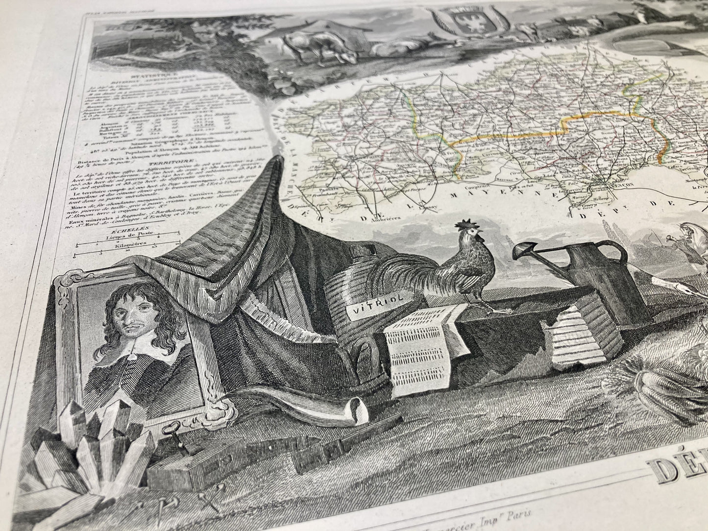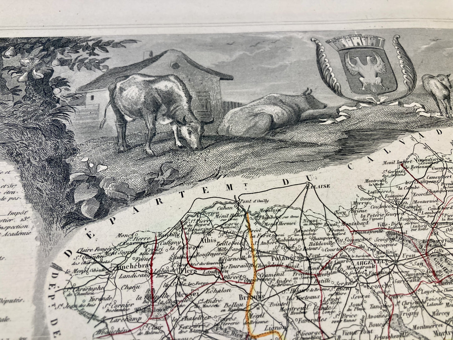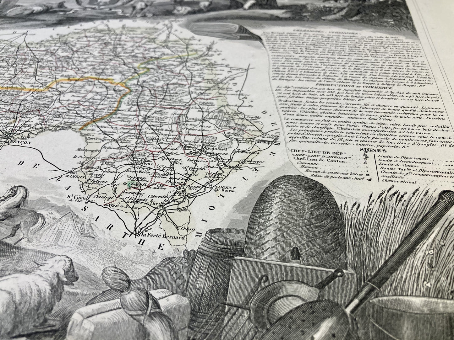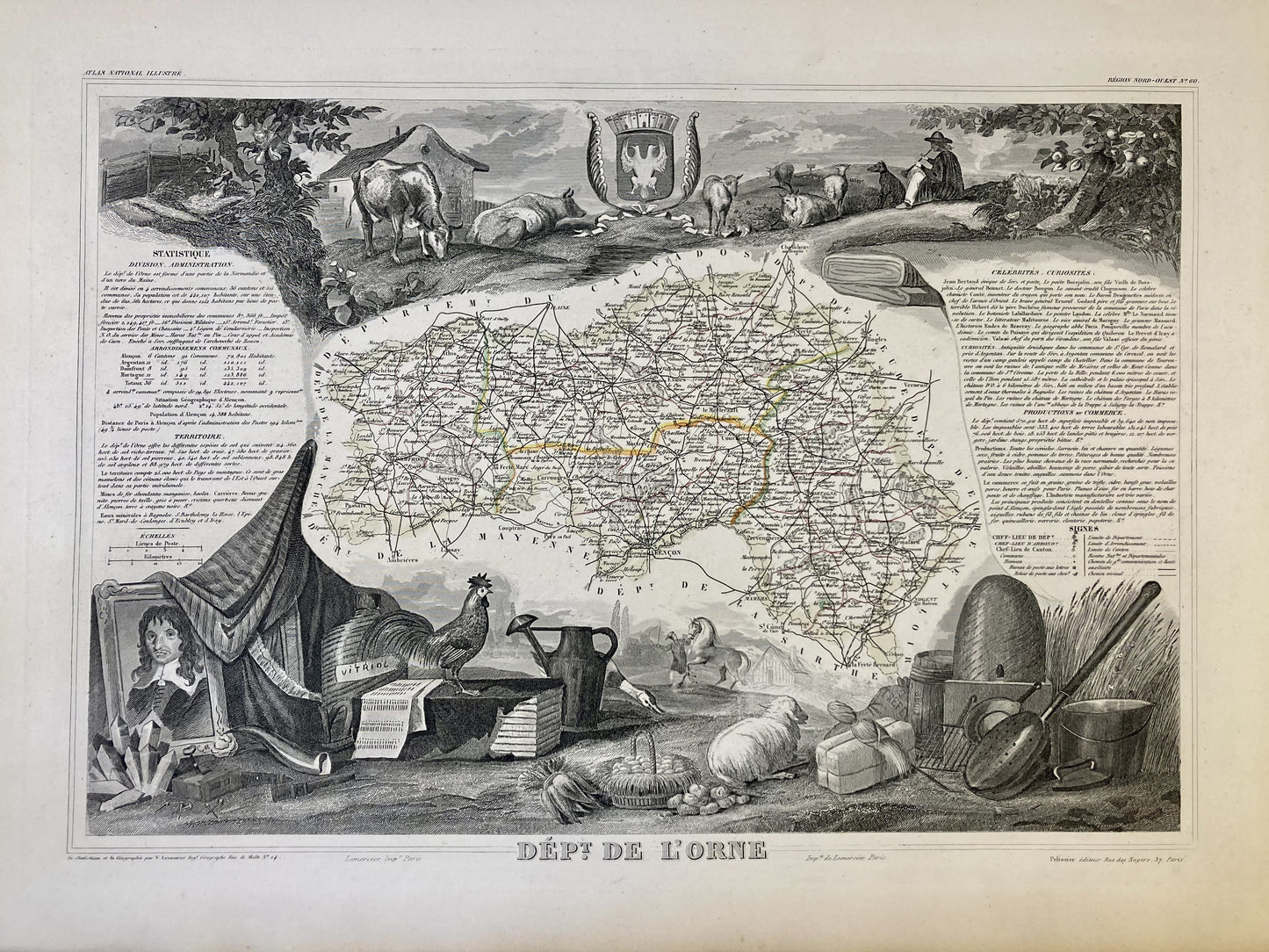 Cette carte ancienne de l'Orne est ornée d'illustrations représentant ses spécialités et quelques informations statistiques, historiques et économiques. Elle est issue de l'Atlas National Illustré et a été réalisée par le Géographe Victor Levasseur entre 1842 et 1872. Sa dimension est de 53x36cm (à 2cm près). On retrouve sur cette carte les villes et villages de l'Orne de l'époque.