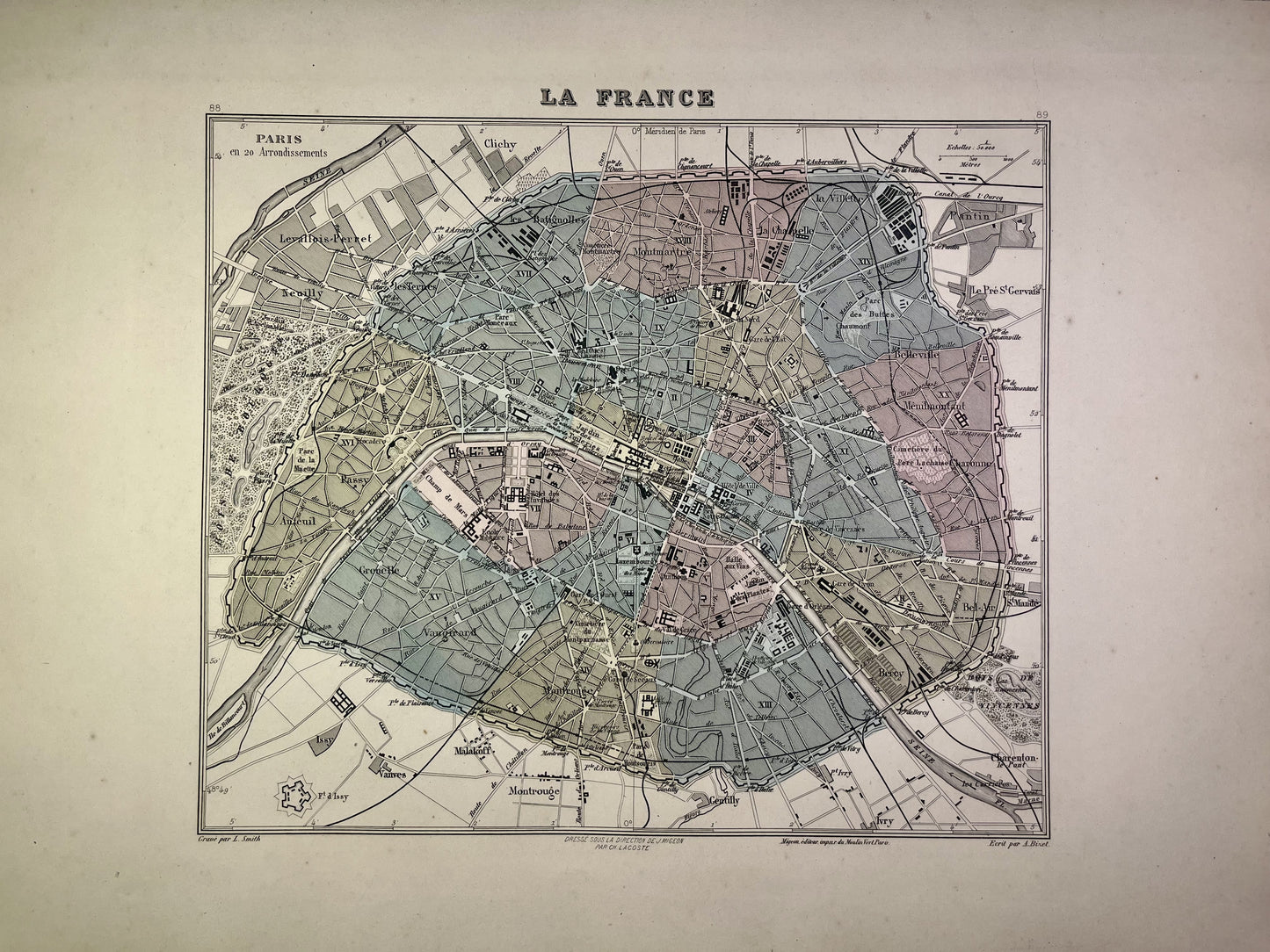 Cette carte ancienne de Paris est colorée et représente les différents arrondissements de la ville. Elle est issue du Nouvel Atlas National Illustré, ouvrage édité durant la fin du XIXe siècle et le début du XXe, et a été réalisée par les Géographes A. Vuillemin, L. Thuillier, Ch. Lacoste et G. Lorsignol. Sa dimension est de 39x29cm. On retrouve sur cette carte les grand monuments de Paris de l'époque.