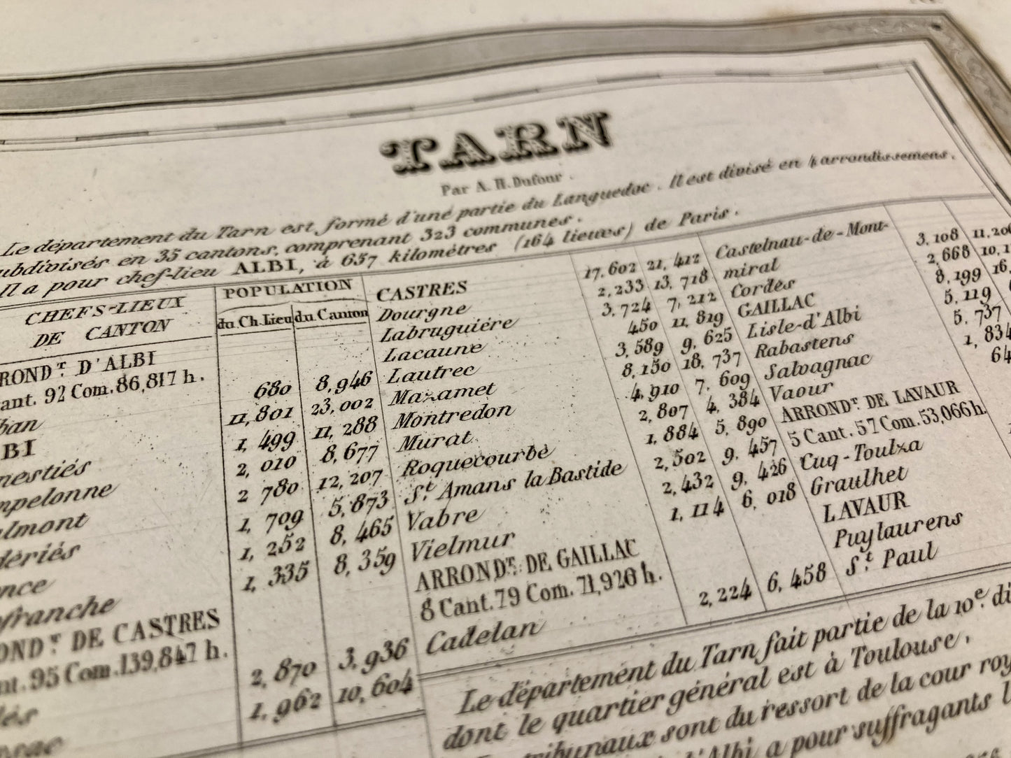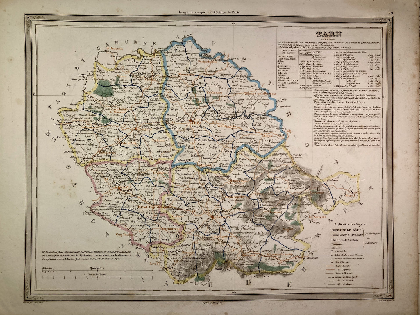 Cette carte ancienne du Tarn accompagnée de quelques statistiques est issue de l'Atlas des 86 départements et des Colonies françaises. Elle a été réalisée par le Géographe Auguste-Henri Dufour et imprimée au cours du XIXè siècle. Sa dimension est de 41x32cm.
