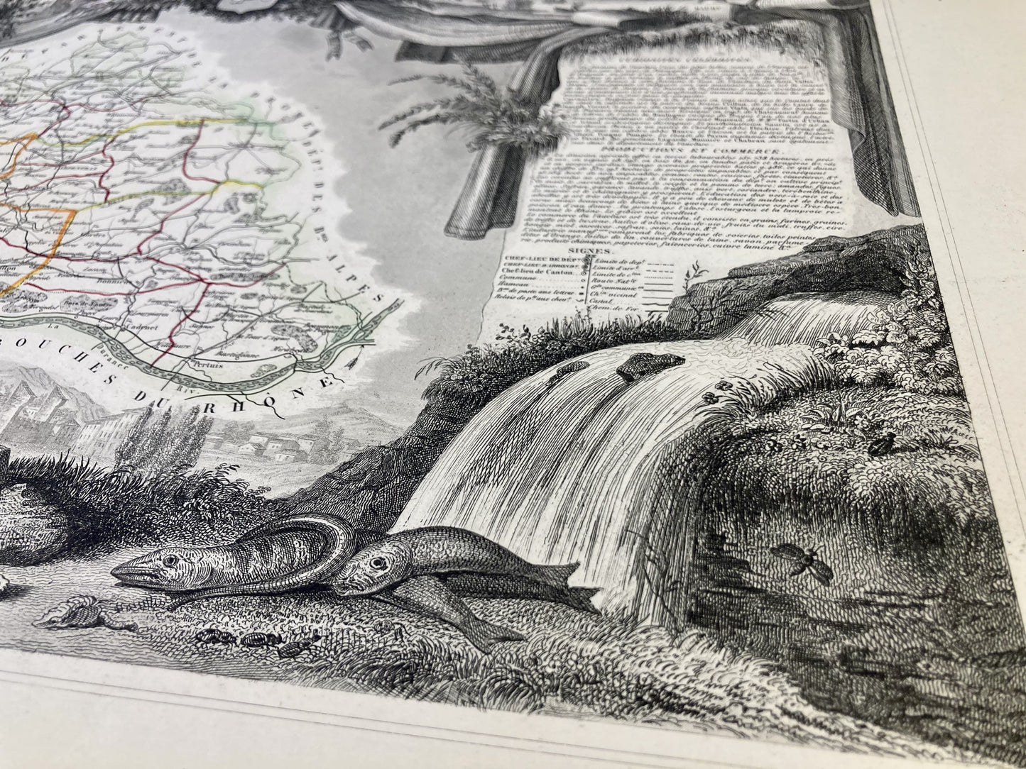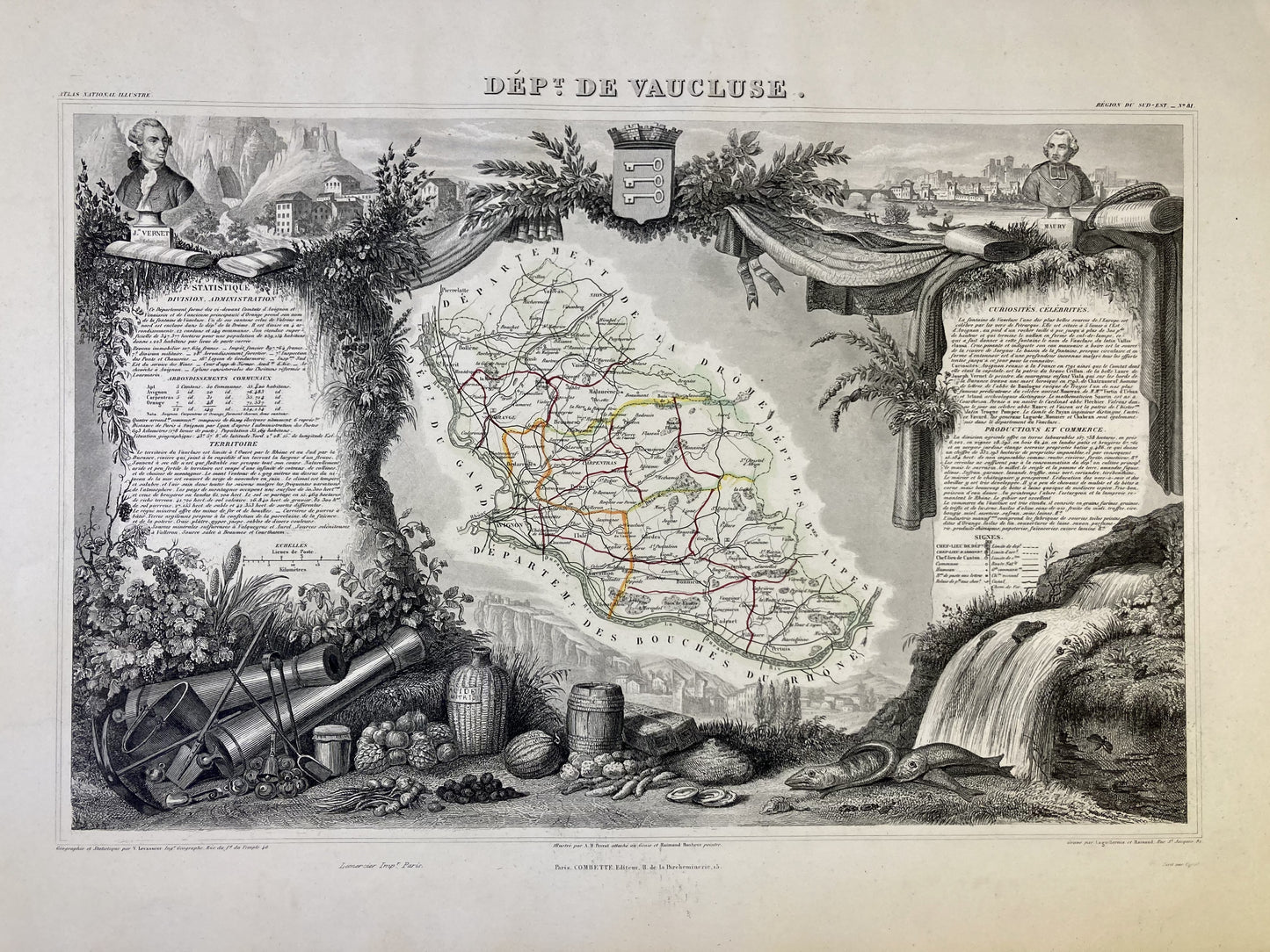 Cette carte ancienne du Vaucluse est ornée d'illustrations représentant ses spécialités et quelques informations statistiques, historiques et économiques. Elle est issue de l'Atlas National Illustré et a été réalisée par le Géographe Victor Levasseur entre 1842 et 1872. Sa dimension est de 53x36cm (à 2cm près). On retrouve sur cette carte les villes et villages du Vaucluse de l'époque.