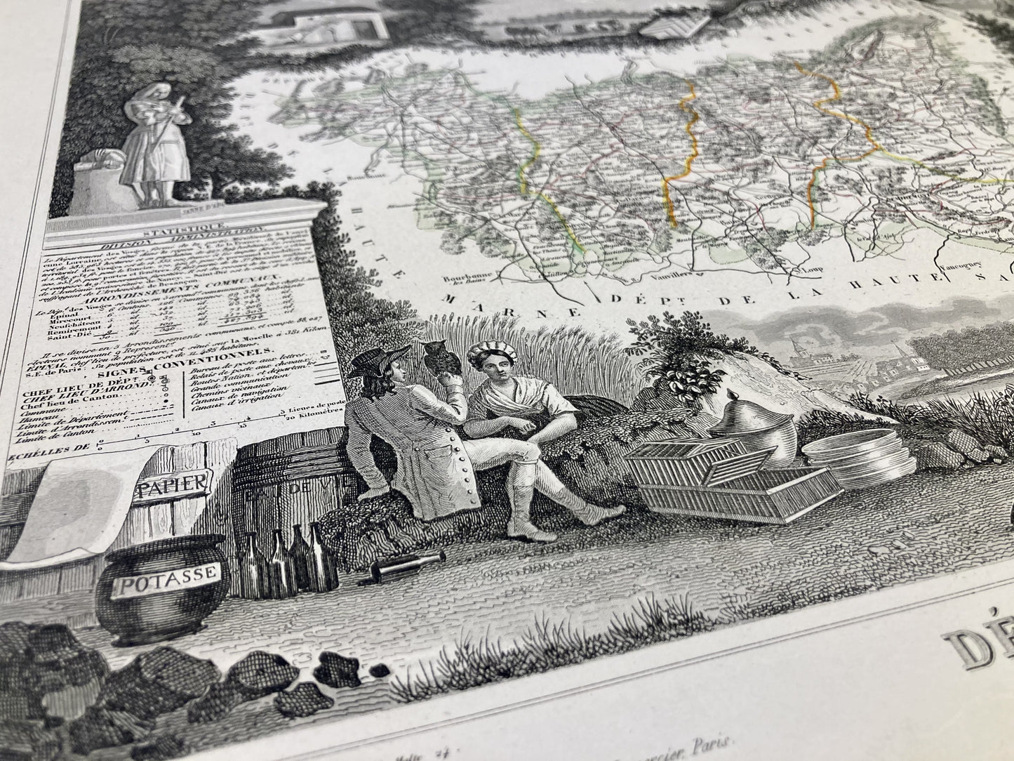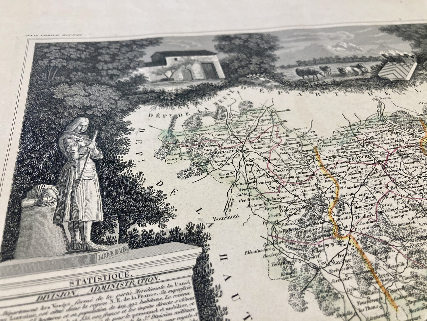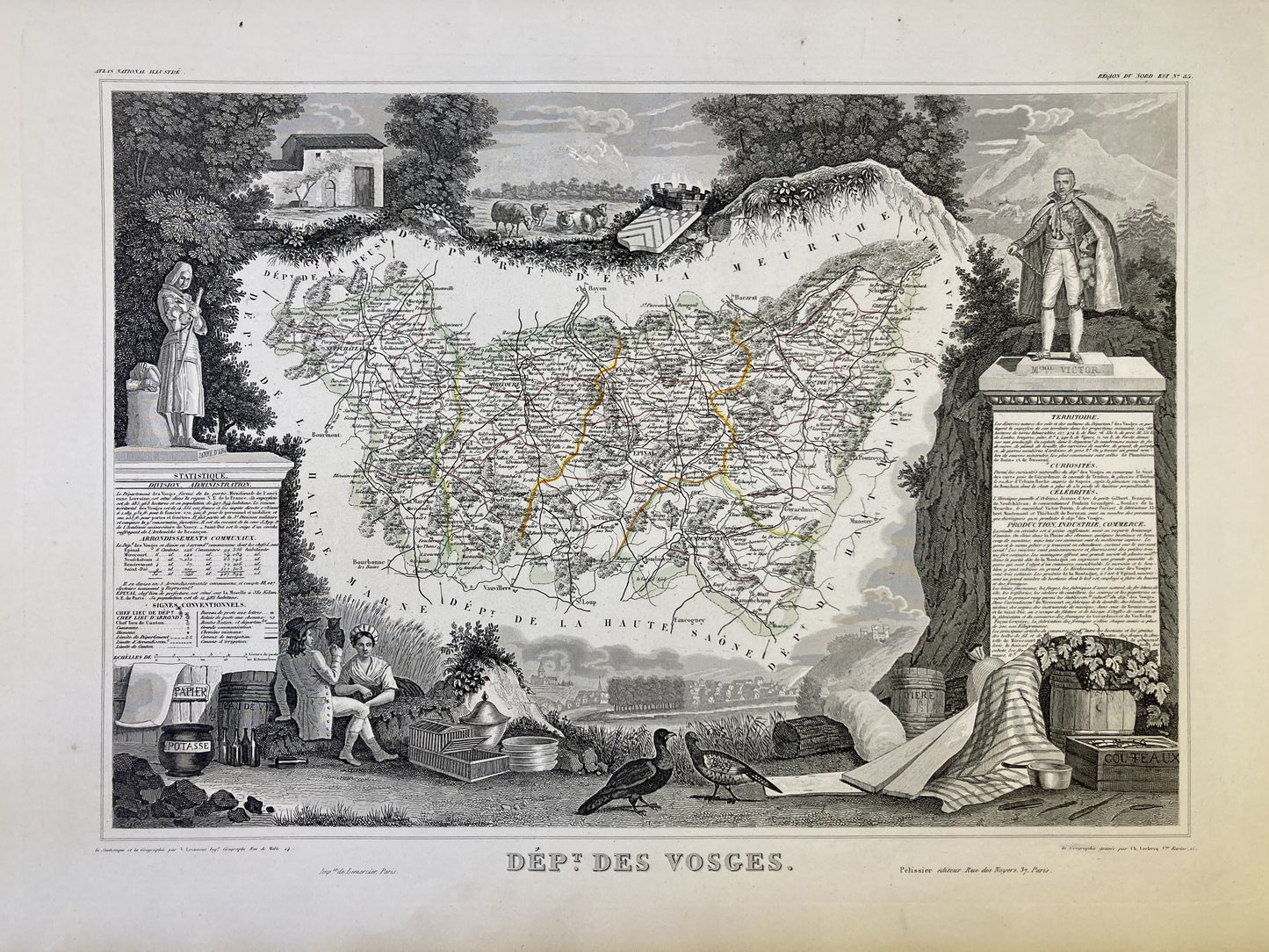 Cette carte ancienne des Vosges est ornée d'illustrations représentant ses spécialités et quelques informations statistiques, historiques et économiques. Elle est issue de l'Atlas National Illustré et a été réalisée par le Géographe Victor Levasseur entre 1842 et 1872. Sa dimension est de 53x36cm (à 2cm près). On retrouve sur cette carte les villes et villages des Vosges de l'époque.