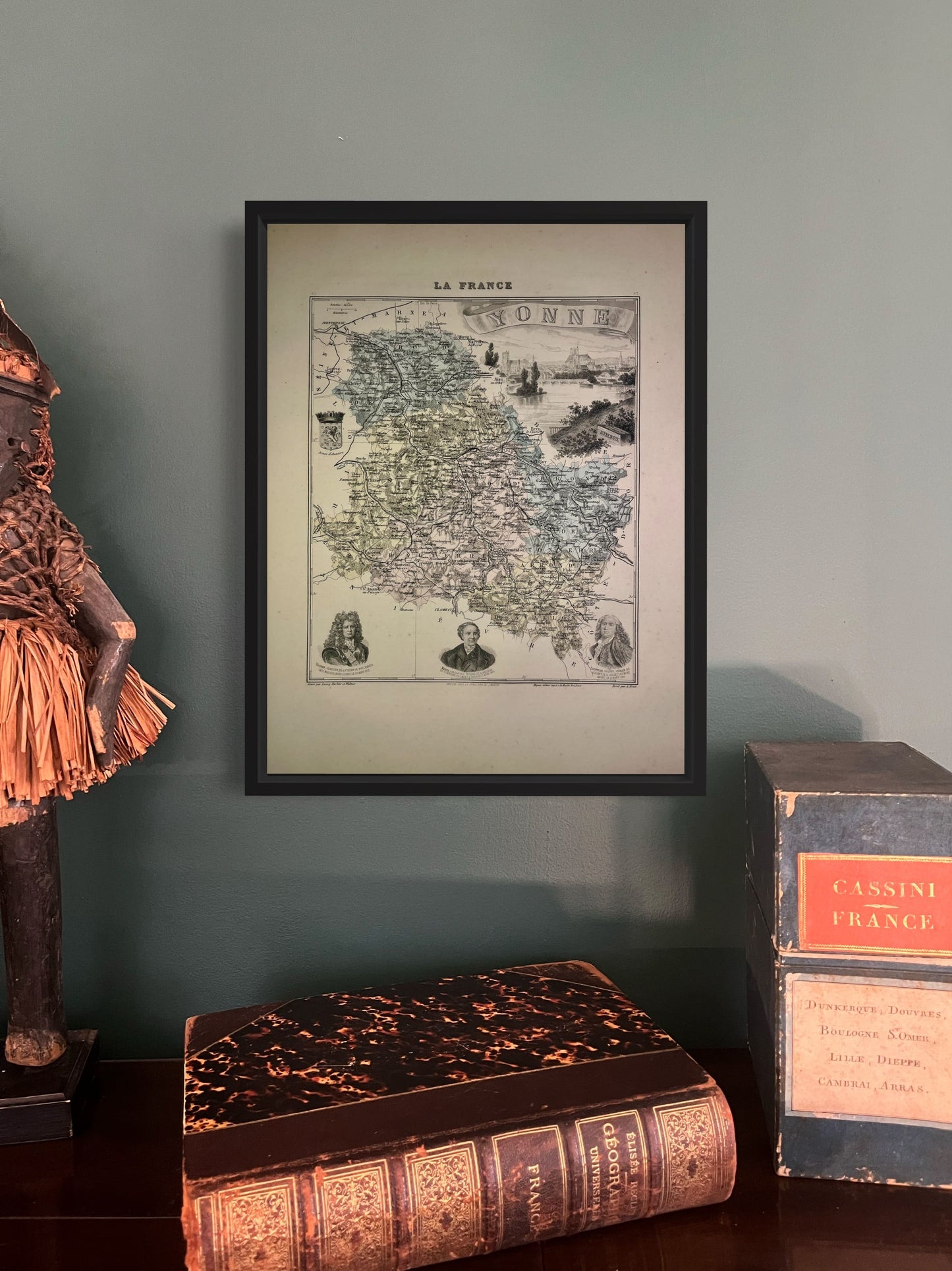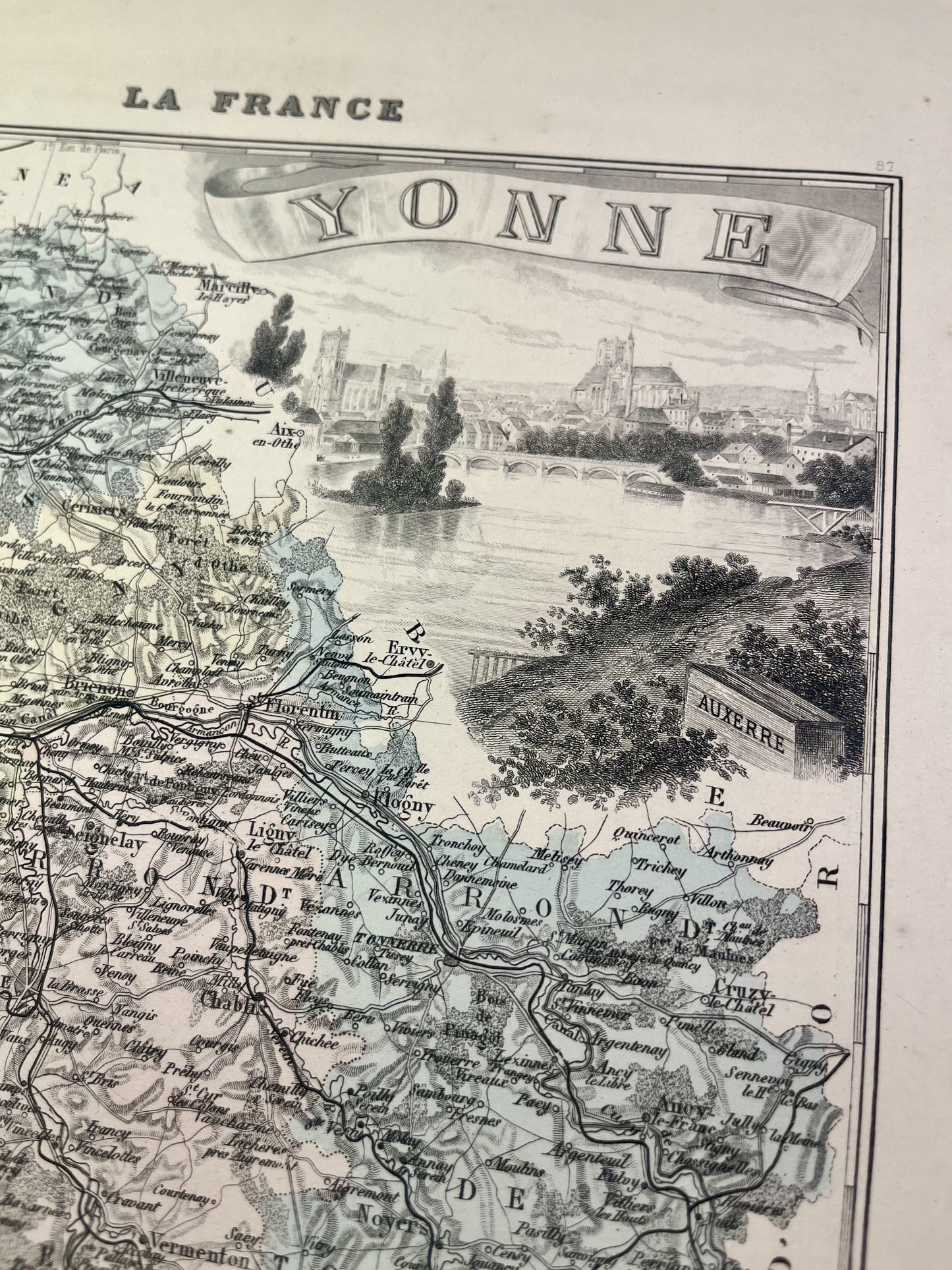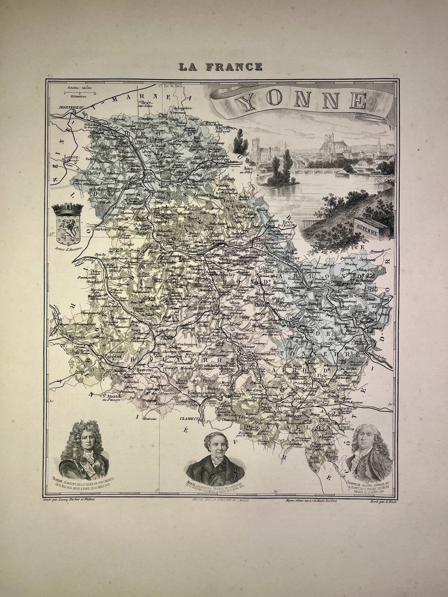 Cette carte ancienne de l'Yonne est colorée et ornée d'illustrations représentant des personnages illustres du département ainsi qu'une vue de la ville d'Auxerre. Elle est issue du Nouvel Atlas National Illustré, ouvrage édité durant la fin du XIXe siècle et le début du XXe, et a été réalisée par les Géographes A. Vuillemin, L. Thuillier, Ch. Lacoste et G. Lorsignol. Sa dimension est de 39x29cm. On retrouve sur cette carte les villes et villages de l'Yonne de l'époque.