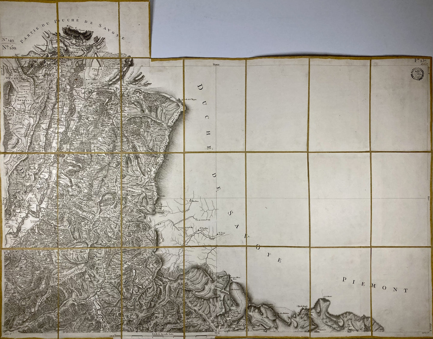 Cette carte de Cassini entoilée ancienne intitulée "Montmellian" (N°149 et 150) a été réalisée par la famille Cassini. Elle date du XVIIIe siècle et sa dimension est de 92,5x59,5cm sans l'ajout du N°149 (24 panneaux).