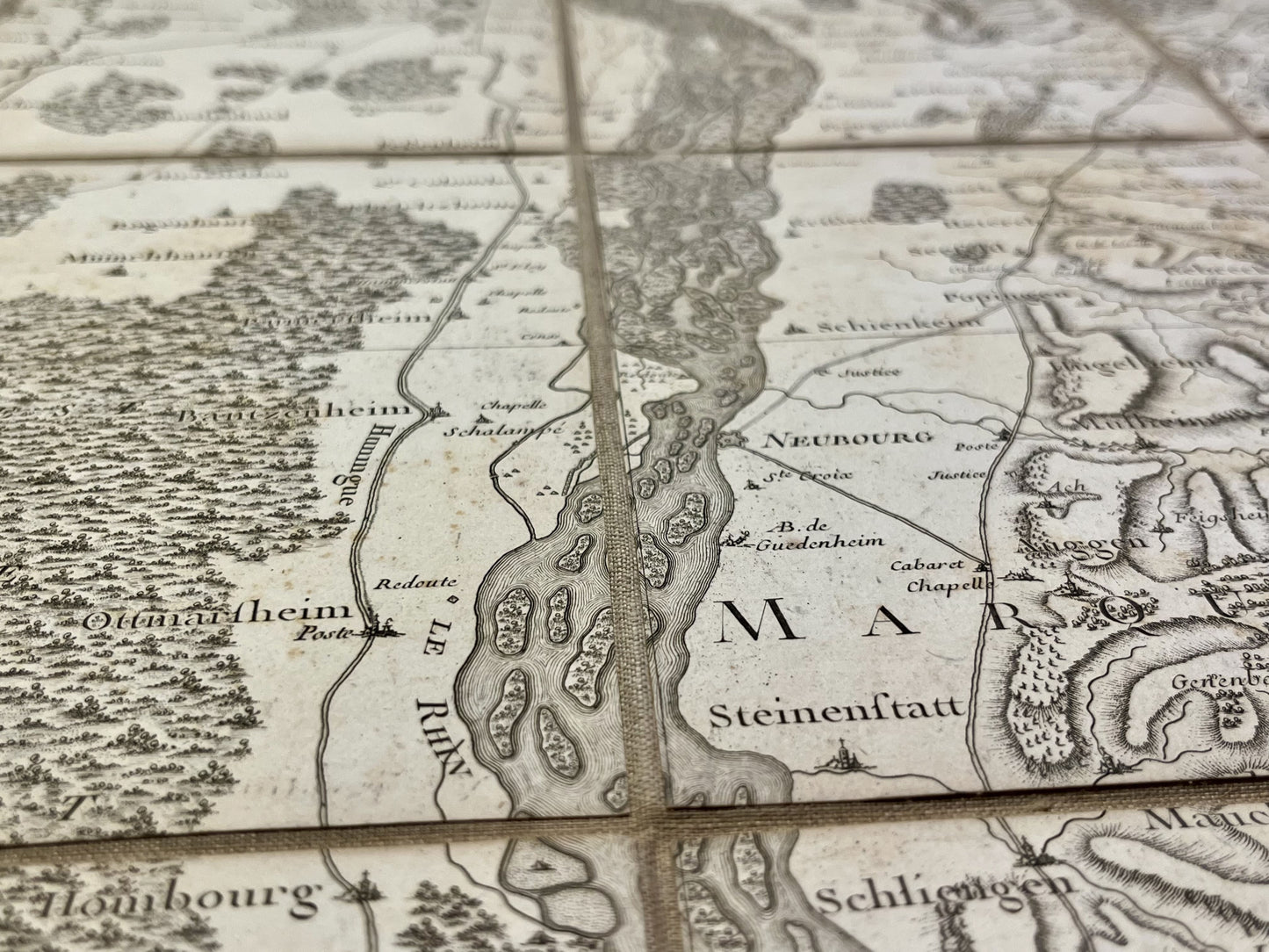 Cette carte de Cassini entoilée ancienne intitulée "Neuf-Brisach" (N°164) représente une grande partie du Haut-Rhin. Elle a été réalisée par la famille Cassini à la fin du XVIIIe siècle. Entourée d'un liseré bleu, sa dimension dépliée est de 94,5x60cm (18 sections).