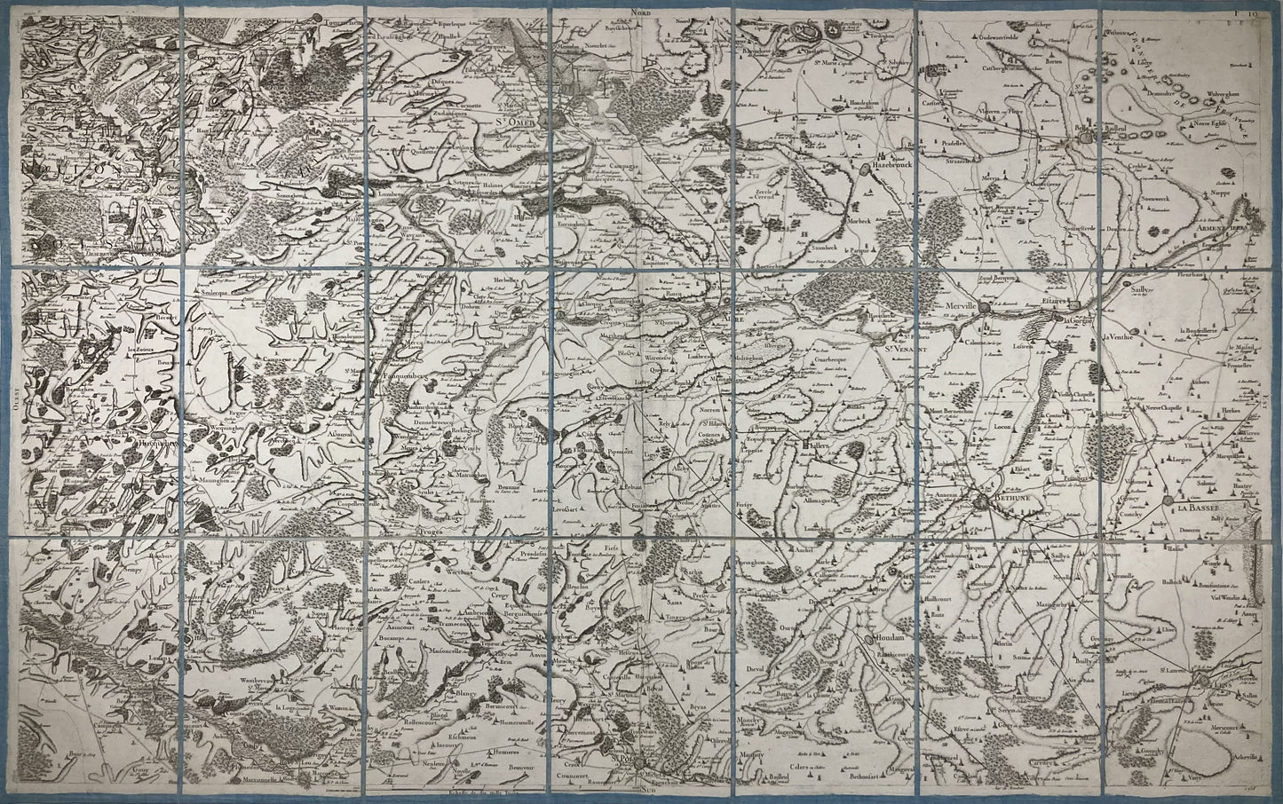 Cette carte de Cassini entoilée ancienne intitulée "Saint-Omer" (N°5) a été réalisée par la famille Cassini. Elle est datée de 1758 et sa dimension est de 94x59cm (21 panneaux).