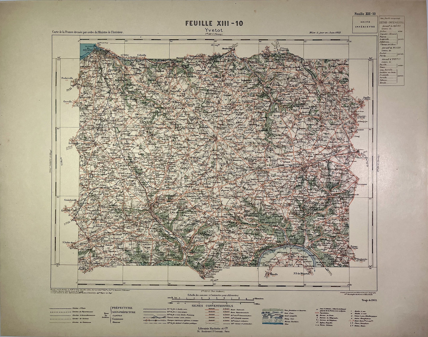 Cette carte ancienne de la Seine-Maritime intitulée "Yvetot" (XIII-10), a été réalisée par le Ministère de l'Intérieur de la fin du XIXe au début du XXe siècle. Sa dimension est de 57x45cm. Pour en savoir plus, découvrez mon article sur la carte du Service Vicinal.