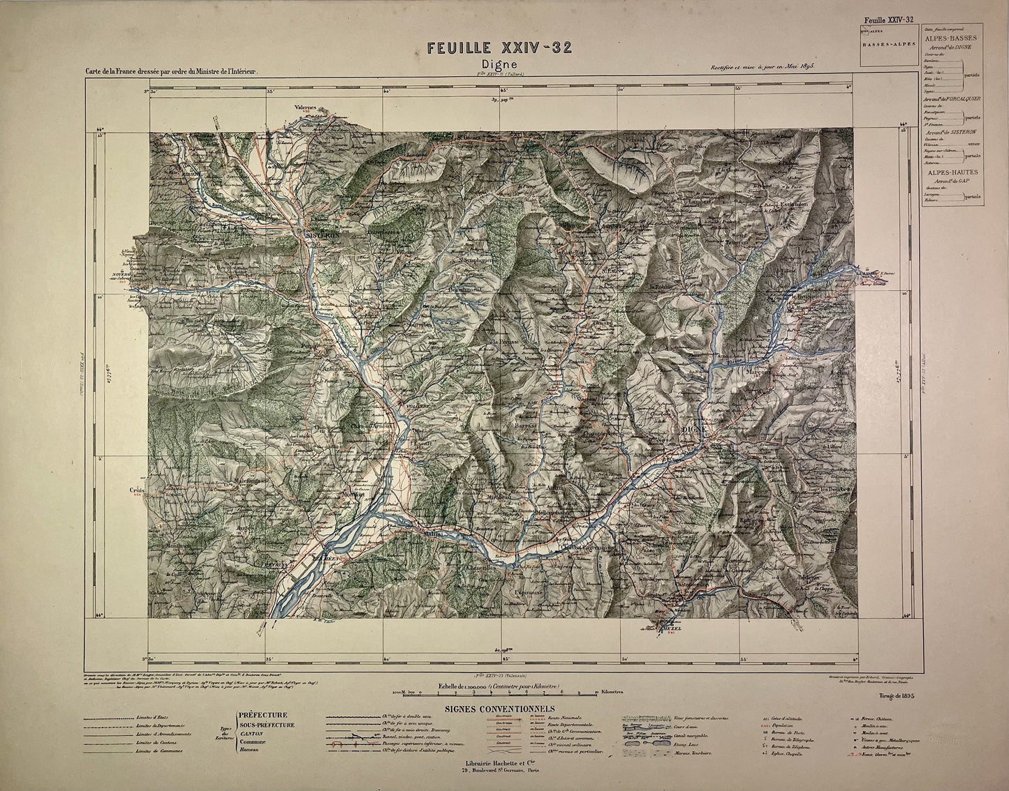 Cette carte ancienne des Alpes-de-Haute-Provence intitulée "Digne" (XXIV-32), a été réalisée par le Ministère de l'Intérieur de la fin du XIXe au début du XXe siècle. Sa dimension est de 57x45cm. Pour en savoir plus, découvrez mon article sur la carte du Service Vicinal.