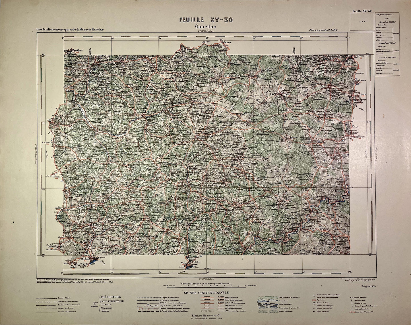 Cette carte ancienne du Lot intitulée "Gourdon" (XV-30), a été réalisée par le Ministère de l'Intérieur de la fin du XIXe au début du XXe siècle. Sa dimension est de 57x45cm. Pour en savoir plus, découvrez mon article sur la carte du Service Vicinal.