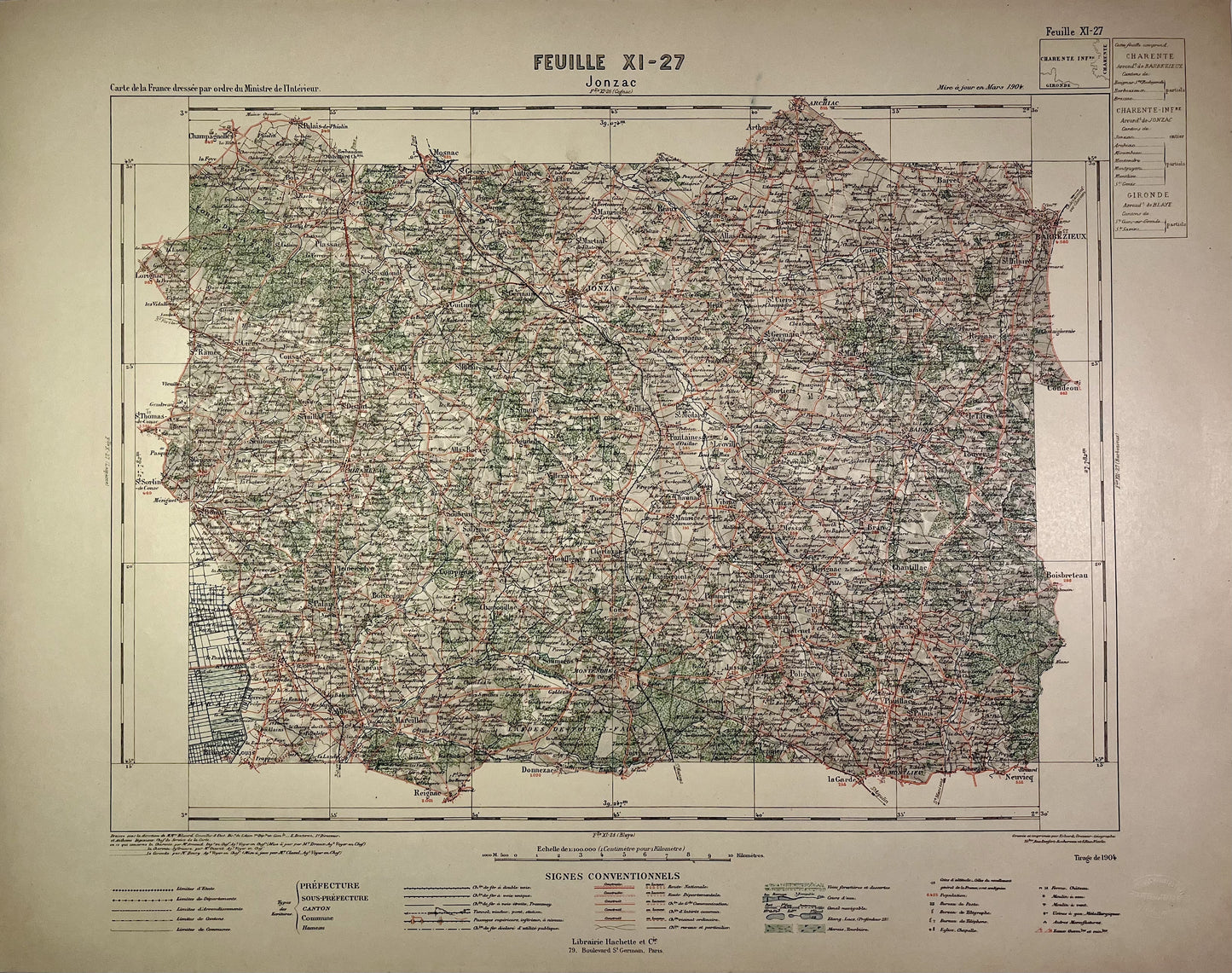 Cette carte ancienne de la Charente-Maritime intitulée "Jonzac" (XI-27), a été réalisée par le Ministère de l'Intérieur de la fin du XIXe au début du XXe siècle. Sa dimension est de 57x45cm. Pour en savoir plus, découvrez mon article sur la carte du Service Vicinal.