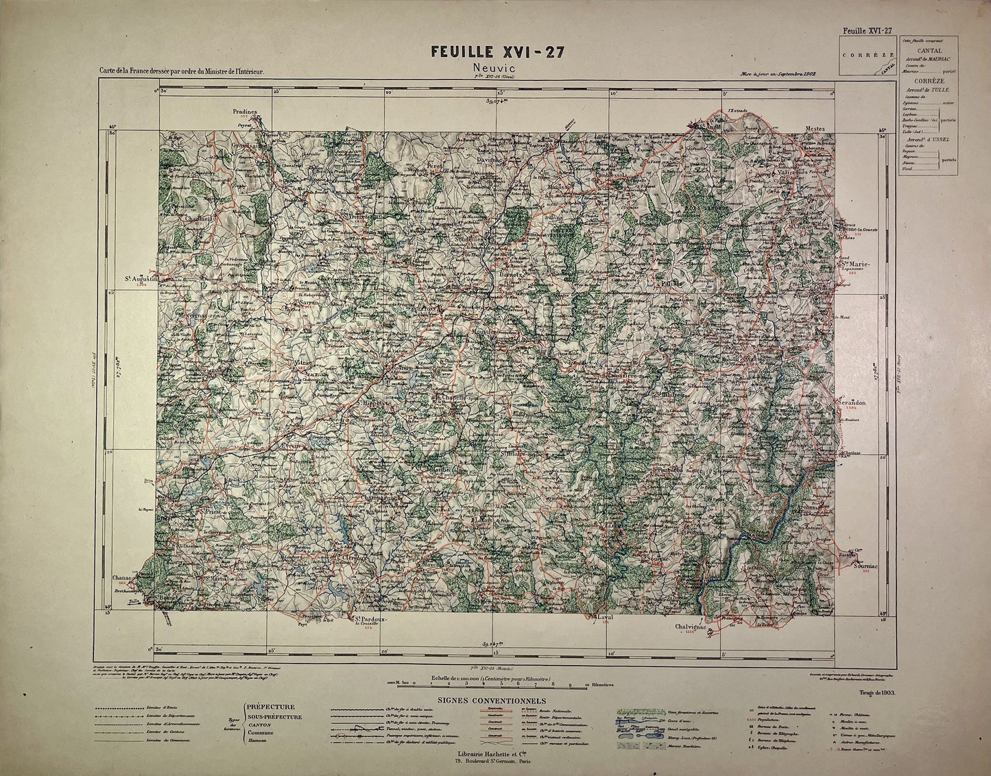 Cette carte ancienne de la Corrèze intitulée "Neuvic" (XVI-27), a été réalisée par le Ministère de l'Intérieur de la fin du XIXe au début du XXe siècle. Sa dimension est de 57x45cm. Pour en savoir plus, découvrez mon article sur la carte du Service Vicinal.
