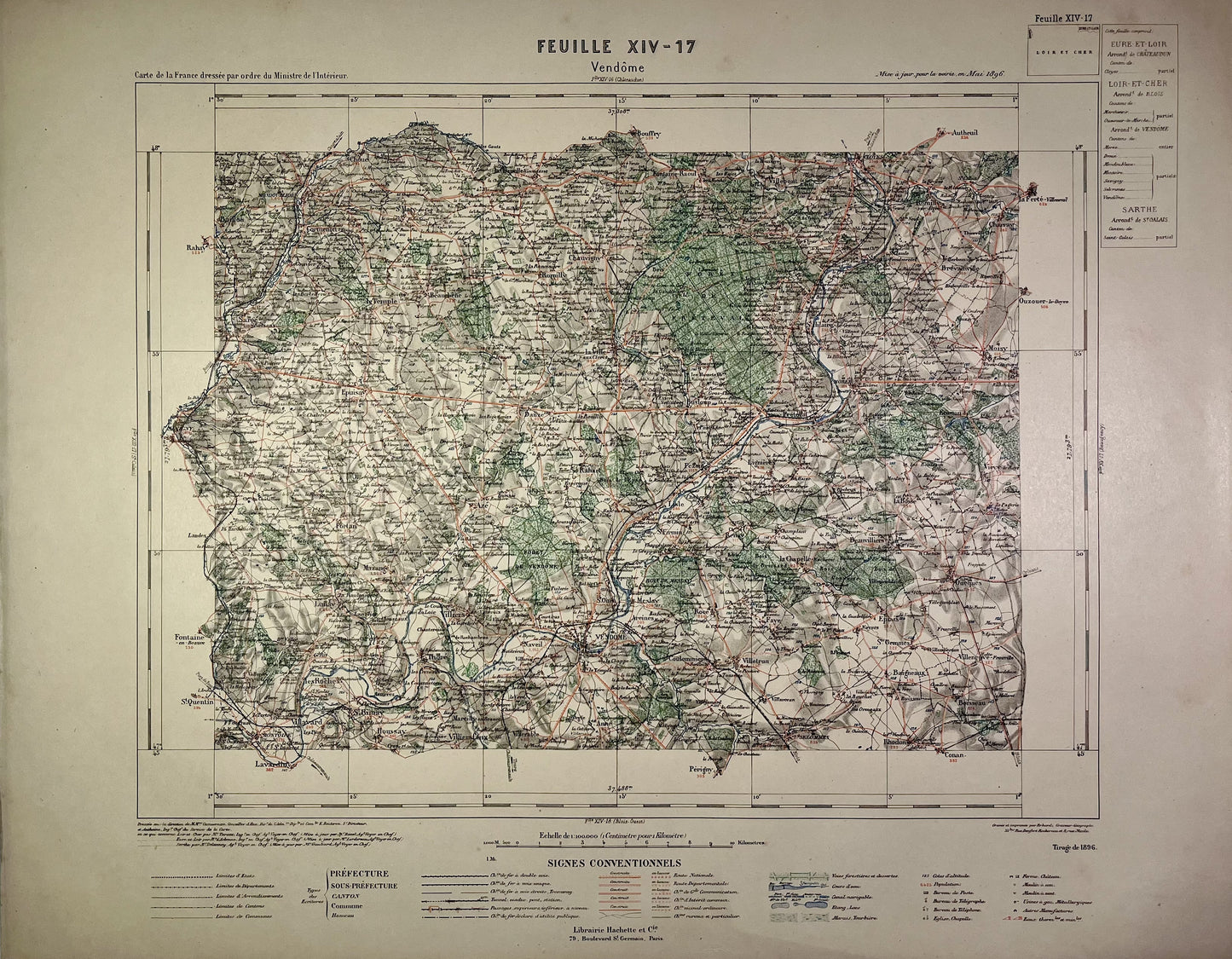Cette carte ancienne du Loir-et-Cher intitulée "Vendôme" (XIV-17), a été réalisée par le Ministère de l'Intérieur de la fin du XIXe au début du XXe siècle. Sa dimension est de 57x45cm. Pour en savoir plus, découvrez mon article sur la carte du Service Vicinal.