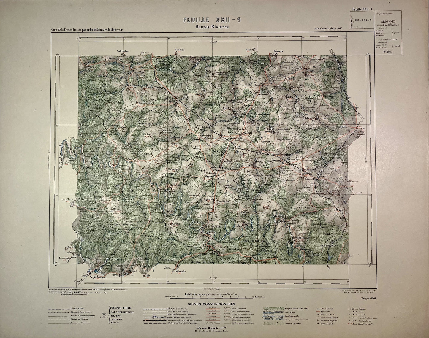 Cette carte ancienne des Ardennes intitulée "Hautes Rivières" (XXII-9), a été réalisée par le Ministère de l'Intérieur de la fin du XIXe au début du XXe siècle. Sa dimension est de 57x45cm. Pour en savoir plus, découvrez mon article sur la carte du Service Vicinal.